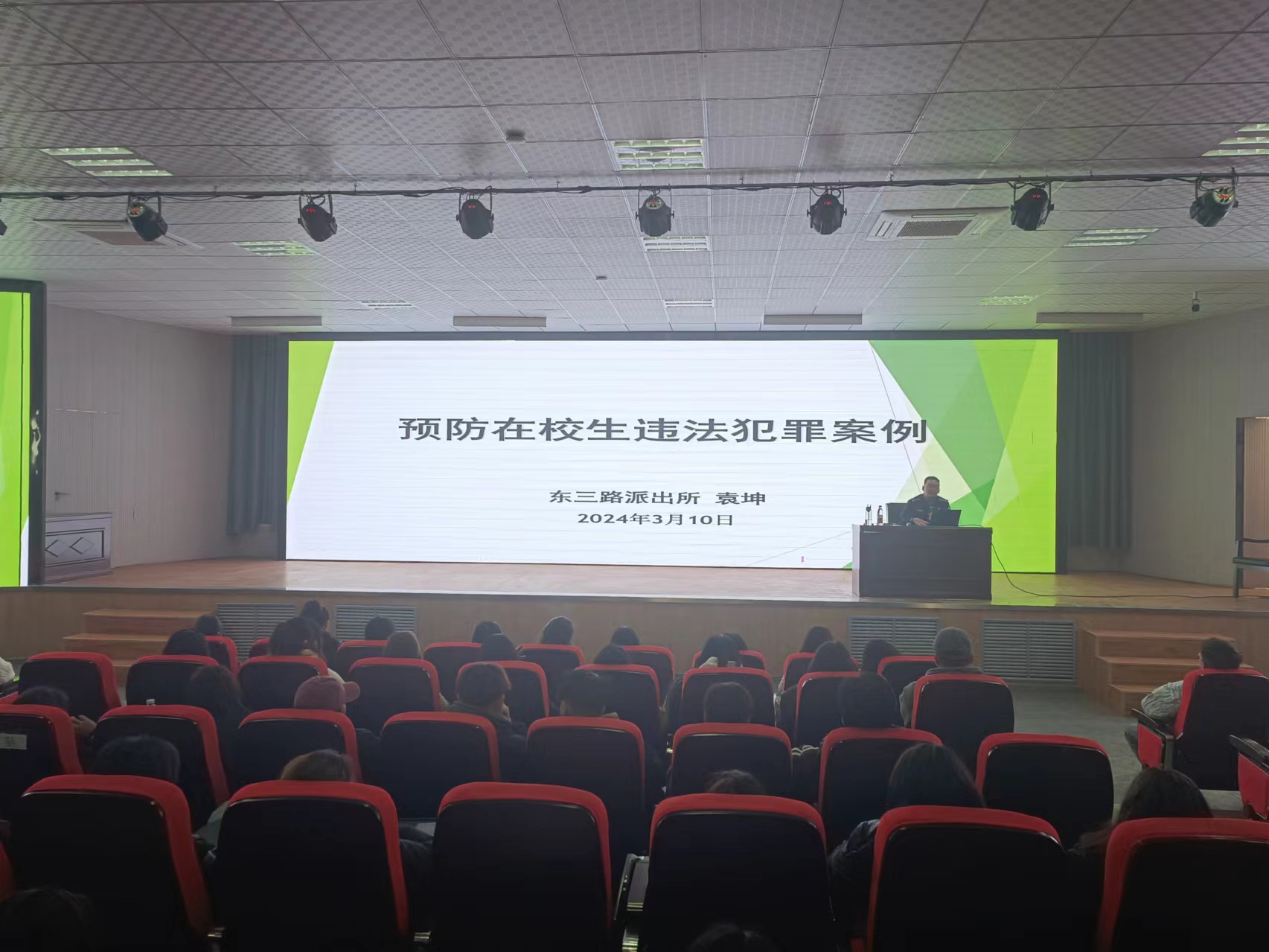 学字提效,着力实现高质量完成普法。针对普法工作中存在的不能讲、不敢讲、不会讲等问题,学院邀请法治副校长东三路派出所所长袁坤、开发区分局政委唐伟及辖区民警入校开展法制安全讲座。警官以普法宣传教育为切入点,通过运用案例、场景模拟等训练,以“教”和“学”的互动,从办案实际、社会热点问题入手,以案释法,以事育人,围绕大安全法制教育、新型AI诈骗、不正当言论、软件洗钱等开展生动讲解,结束后开展了线上考试。课堂法治宣讲活动开展18次,参与学生多达8000余人,系列宣讲活动反响热烈,深受好评。