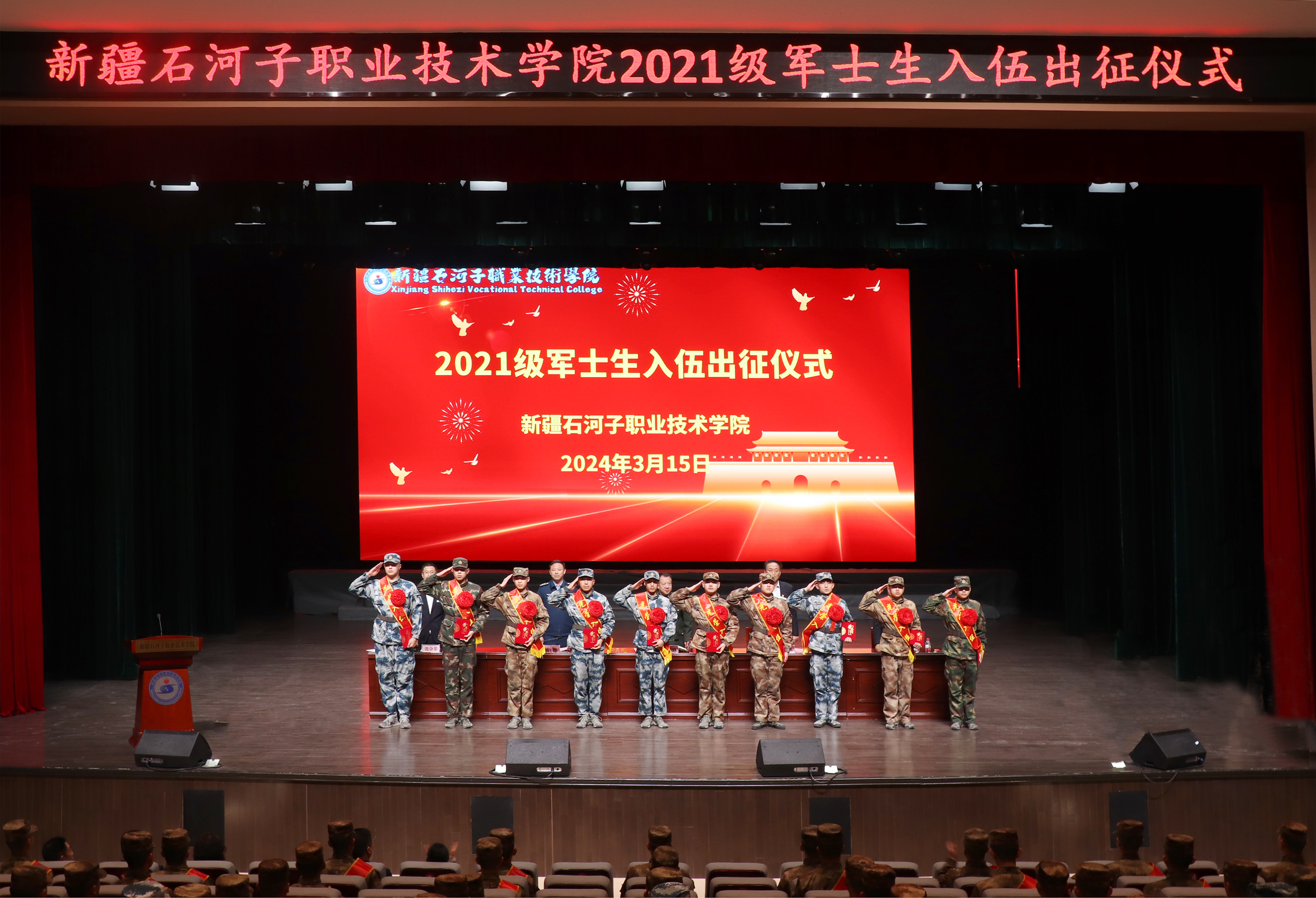 (徐千然 报道)风华正茂抒壮志,参军报国正当时。2024年3月15日,beat365唯一官方网站在学院学术报告厅顺利举行2021级军士生入伍出征仪式,第八师石河子市党委常委、师人武部大校政治委员曹登峰,空军工程大学航空机务士官学校外训大队中校副大队队长高伟,beat365唯一官方网站党委书记史文革、纪委书记万祥军、副院长张金果,二级学院相关领导、军士学院教官,军士学院全体学生及家长代表共同见证了这一庄严、激动人心的时刻。仪式由张金果副院长主持。