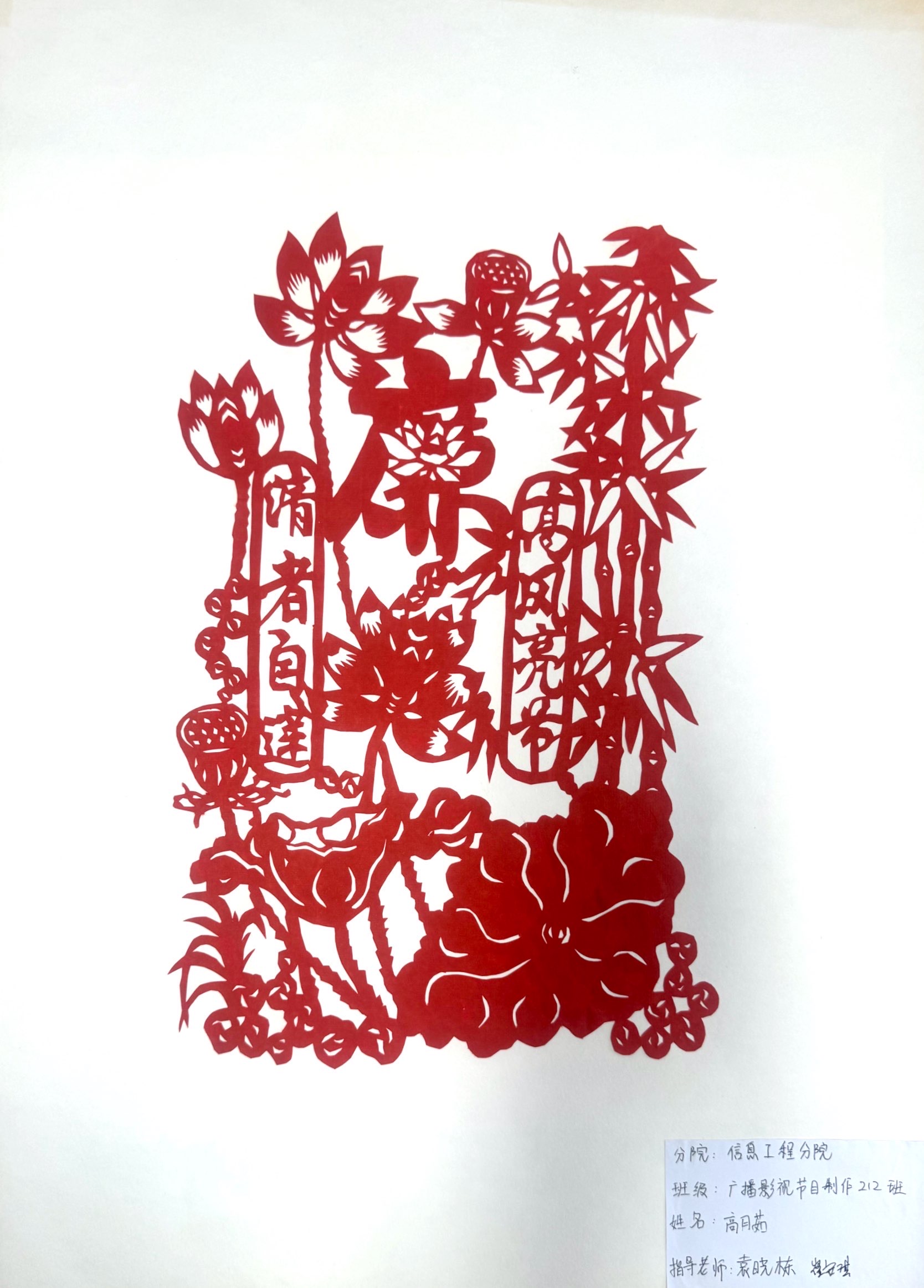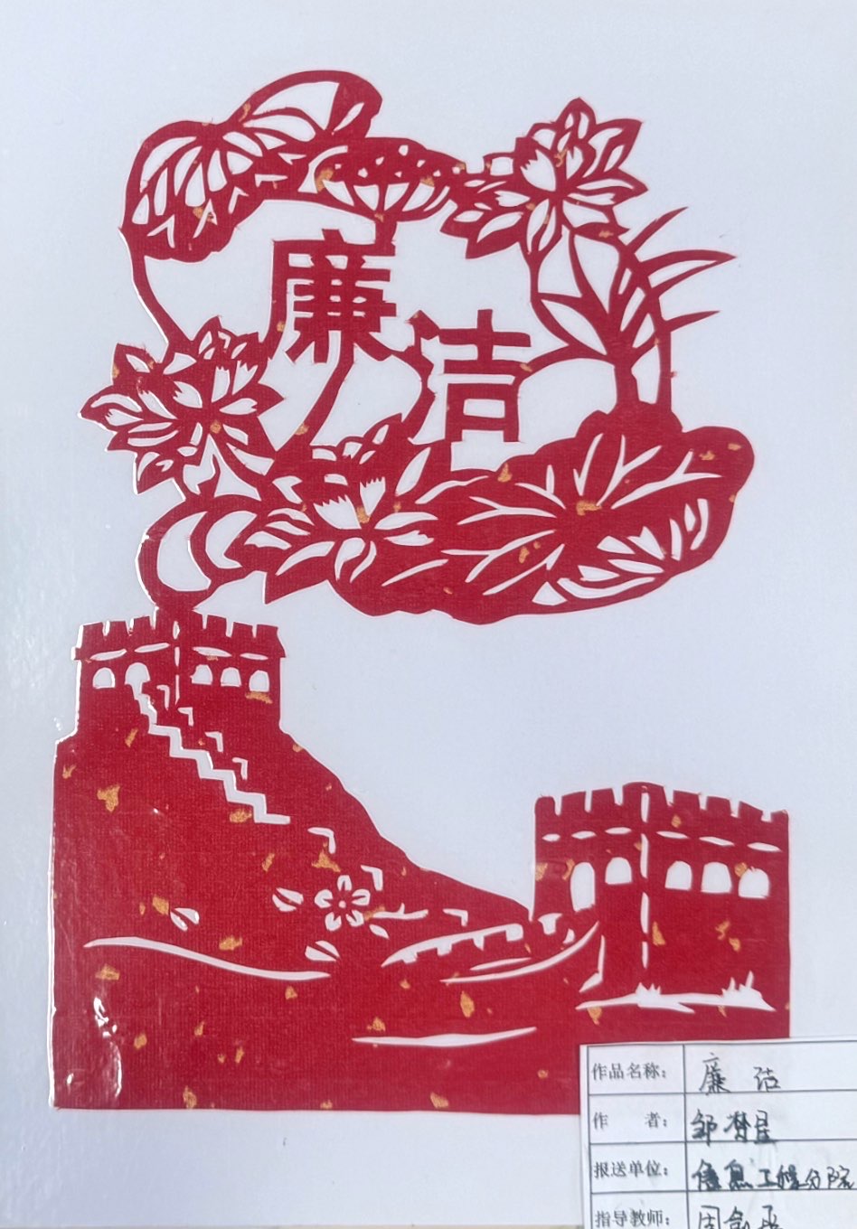 廉洁文化润人心。为了深入挖掘廉政文化内涵,学院纪委面向广大师生征集廉政文化作品,作品涉及书法、绘画、剪纸、摄影、创意手工、广告、海报、宣传片等。广大师生将廉政元素与校园文化、校园生活紧密结合起来,创作的作品形式多样、内涵丰富,体现了广大师生的清正廉洁本色。“我将兵团精神、老兵精神和廉政文化融入到了剪纸当中,我希望大家看到我的作品后,能够感受到兵团人的艰苦奋斗与无私奉献精神。我喜欢剪纸还因为纸张是红色的,红纸和剪出的团案交织在一起,就像看到了先辈们爬雪山、过草地时的那种坚韧不拔和顽强意志。”现代服务学院护理234班学生王怡欣说。