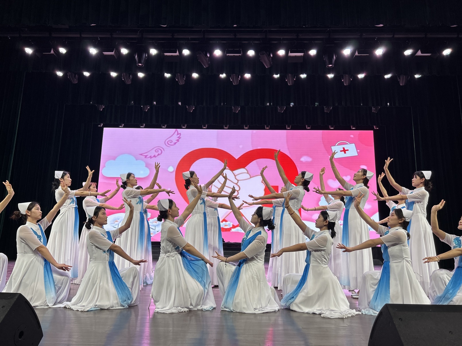 在《中国护士之歌》激昂的旋律中,文艺汇演正式开始,汇演以合唱、舞蹈、乐器演奏、技能展示等多种形式,为观众带来一场精彩纷呈的视听盛宴。校歌《石职之歌》诉说了学院辉煌历程,展现了职院学子的风采和魅力;舞蹈《春暖花开》展现了护理专业学生的蓬勃朝气和护理专业欣欣向荣的美好明天;钢琴和小提琴演奏《你的星河》《我和我的祖国》用琴声赞美祖国的山河壮丽,把汇演推向了高潮,激发了学生的爱国情怀;护理职业技能展示心肺复苏、静脉输液环节,展演学生明确到位的专业用语、娴熟精准的技能操作以及分析问题、解决问题的临床思维,充分体现了“准护士”们的专业素养;诗朗诵《歌颂护士》表达了护理专业学生对护理前辈的敬意和钦佩。汇演尾声《授帽仪式》,伴随着庄严的乐曲,在场全体护理专业学生严整着装,在老师的带领下全体起立,高举右拳庄严宣誓,一句句掷地有声的铮铮誓言在每位宣誓者的心中回响。