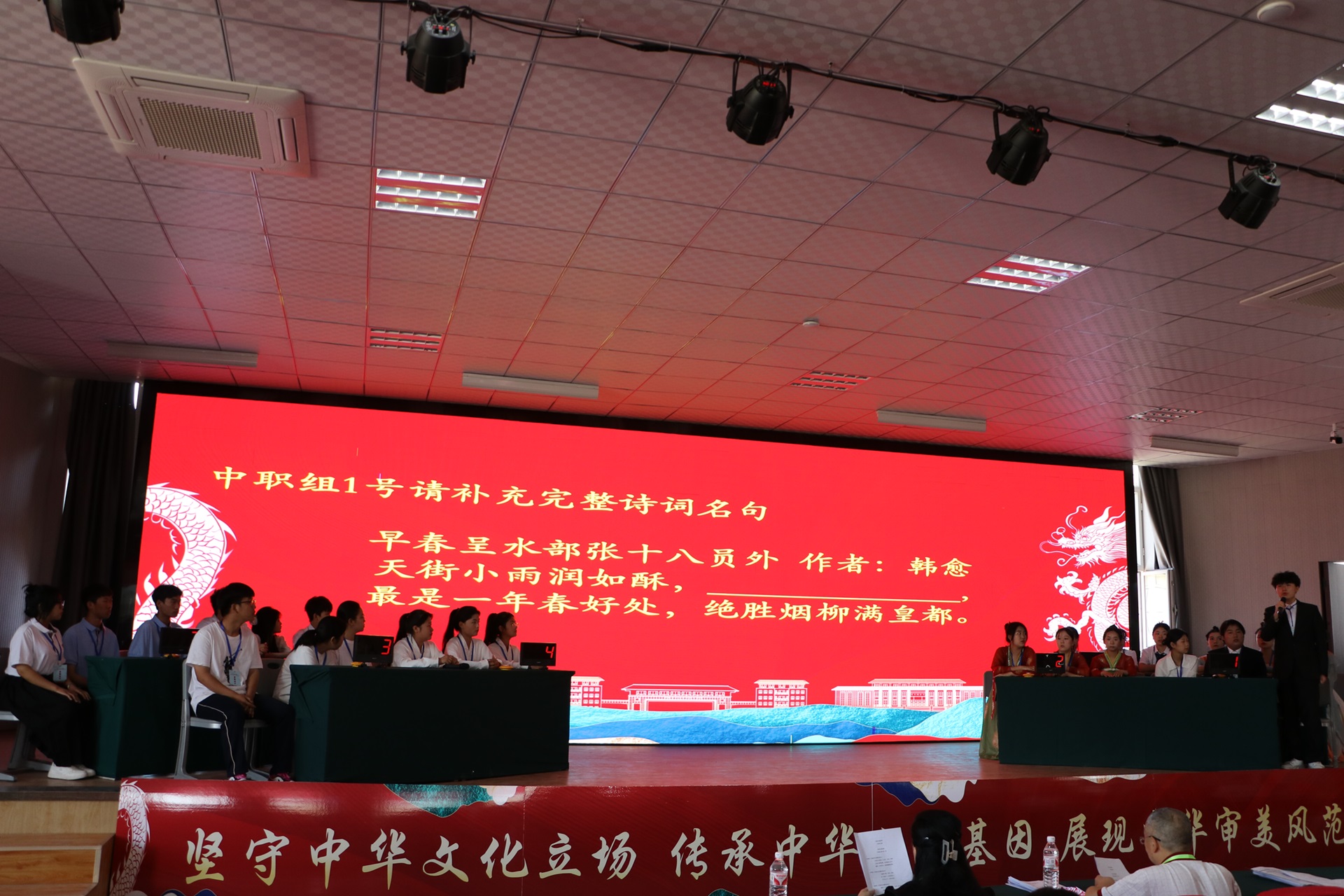 决赛分为自选篇目和即兴抽签两个阶段,以中、高职语文教材优秀传统文化内容为核心,内容涵盖经典名篇、古诗词、文言文等篇目,全方位考验参赛选手们的国学积累、临场应变和应用能力,所有参赛选手必须使用普通话、脱稿朗诵。在即兴抽签诵读阶段,每支参赛队伍推选三名选手依序根据比赛现场抽取朗诵的题目即兴朗诵,内容分为古典诗文和补充完整古典诗文名句朗诵,一篇篇经典美文、一首首诗歌佳作在选手们声情并茂的朗诵中被赋予了时代的活力与生命,比赛精彩的对决和深情的诵读让现场观摩学生产生了“美的享受、德的熏陶、智的启迪”。