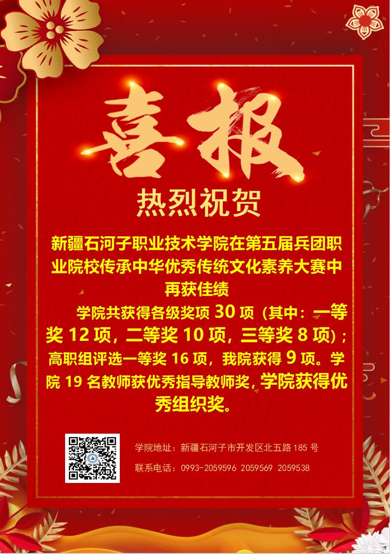 (王需 杨慧 报道)新疆石河子职业技术学院在近日公布的第五届兵团职业院校传承中华优秀传统文化素养大赛中,再次取得优异成绩。学院共计获得30个奖项,包括12个一等奖、10个二等奖和8个三等奖。在高职组的评选中,一等奖共有16个,我院获得9个。19名教师因出色的比赛指导工作荣获优秀指导教师奖,学院荣获优秀组织奖。