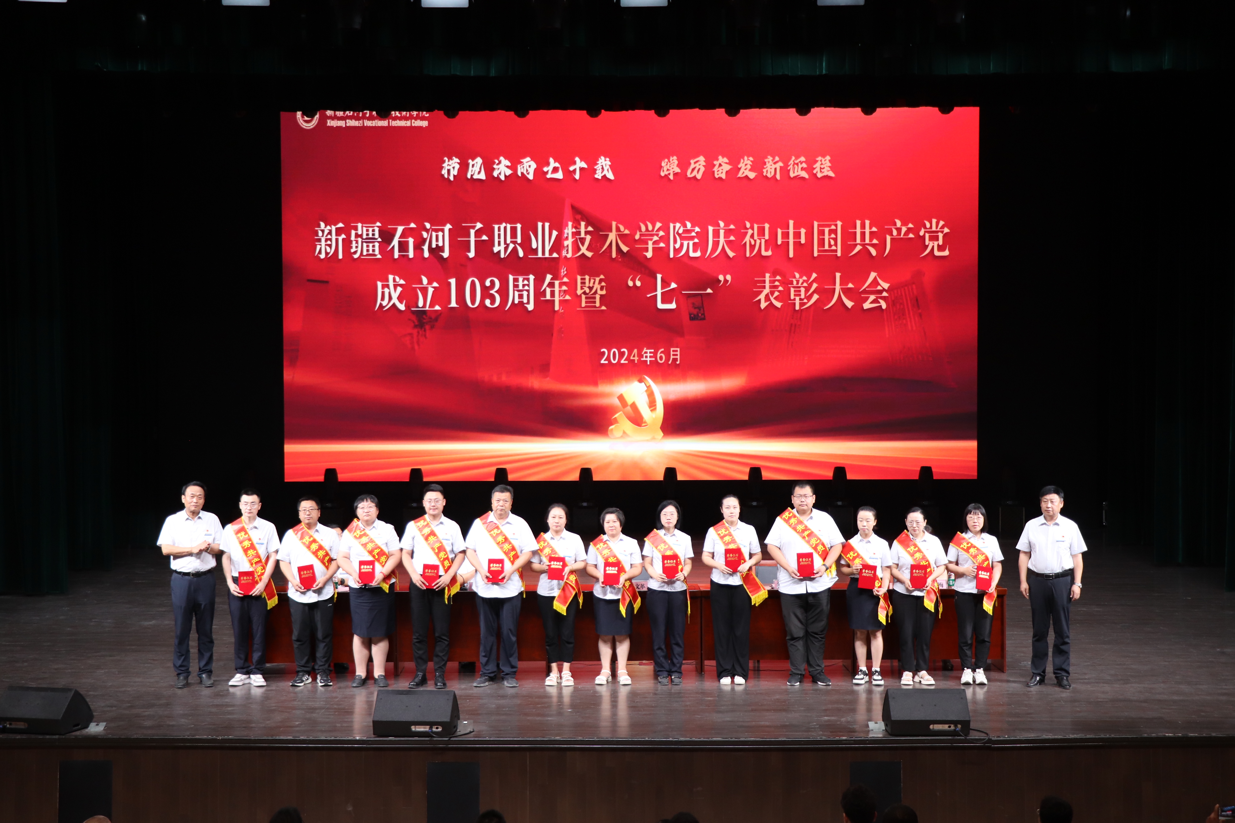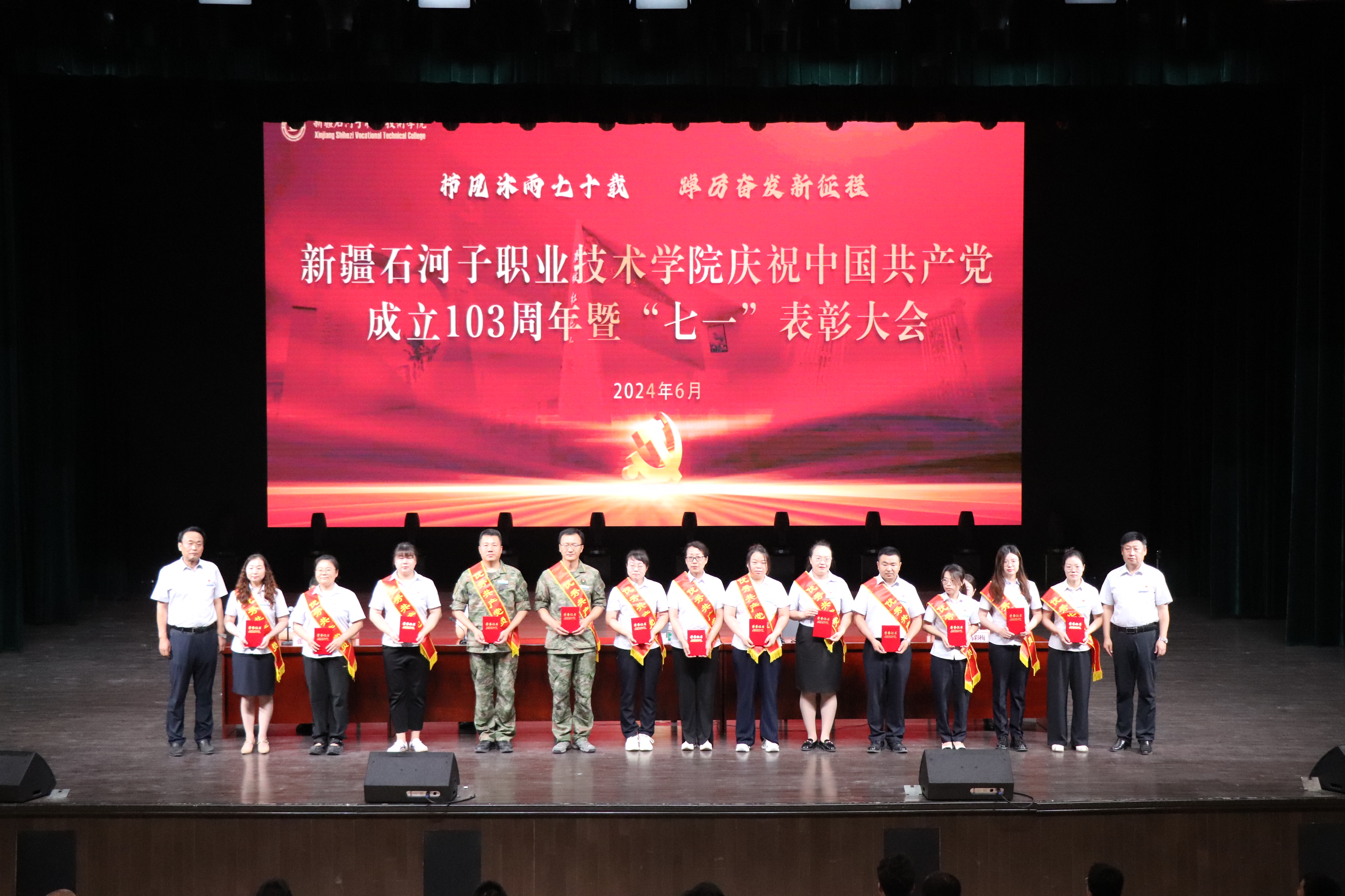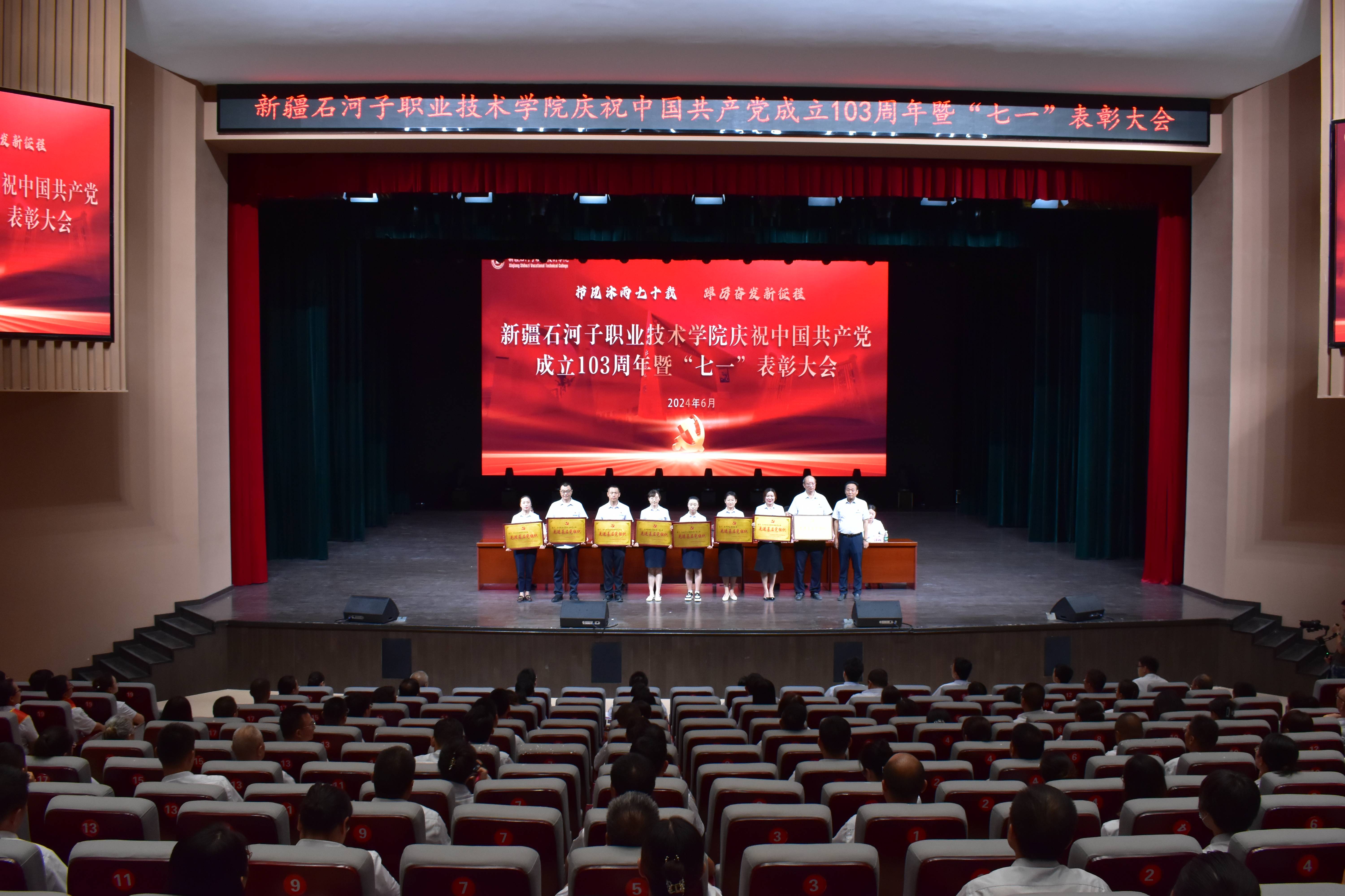表彰先进,树行为之范。为礼赞党的丰功伟绩,传承和弘扬兵团精神,表彰先进典型,展现新时代共产党员风采,学院于6月29日在学术报告厅,学院领导授予8个基层党组织“先进基层党组织”荣誉称号、54名共产党员“优秀共产党员”荣誉称号、6名党务工作者“优秀党务工作者”荣誉称号。优秀共产党员代表郭健同志、优秀党务工作者马晓燕发言表示将不忘初心、牢记使命,以高标准严要求时刻警醒自己,为学院高质量发展作出新的贡献。