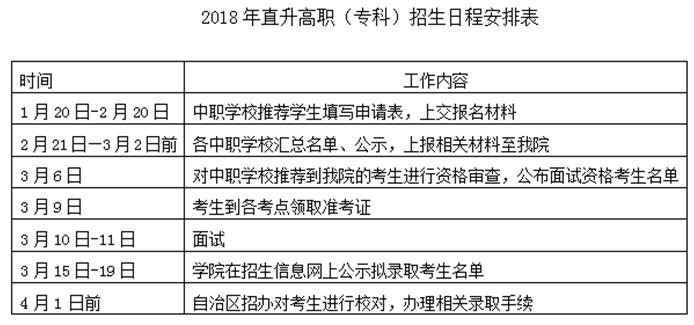 1. 1月20日—2月20日,符合报名条件的中职应届毕业生由所在学校推荐填写《2018年优秀中职毕业生直升高职(专科)申请表》(见附件2)。