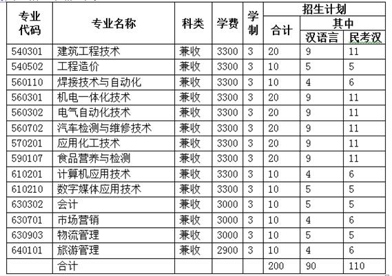 今年我院直升高职(专科)计划200人,其中:汉语言90人,民考汉110人。分专业招生计划如下表: