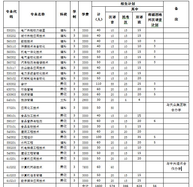 今年我院单独招生计划1400人,其中:汉语言630人,民考汉346人,双语班424人。分专业招生计划见下表