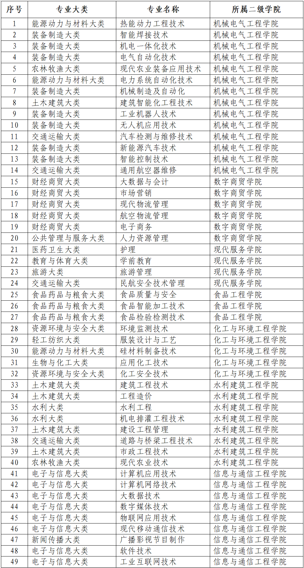 表1 高职专业一览表