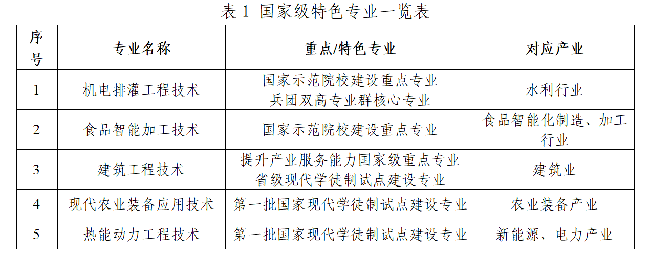 目前,学校有国家级特色专业5个,其中,国家示范院校建设重点专业2个:机电排灌工程技术、食品智能加工技术;第一批国家现代学徒制试点建设专业2个:现代农业装备应用技术热能动力工程技术提升产业服务能力国家级重点专业1个:建筑工程技术