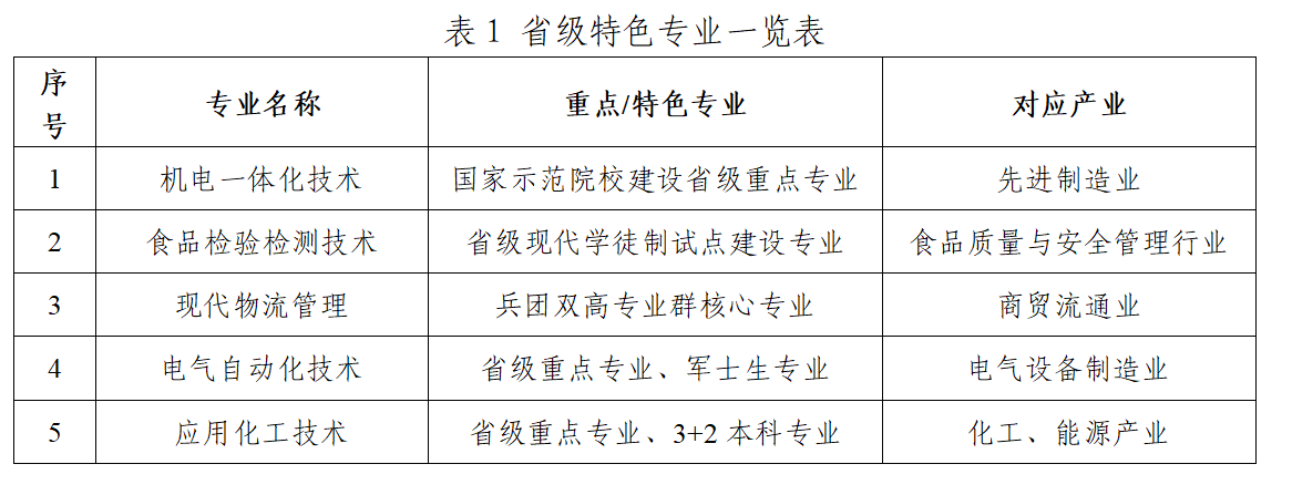 目前,学校有省级特色专业5个,其中,国家示范院校建设省级重点专业1个:机电一体化技术;省级现代学徒制试点建设专业1个:食品检验检测技术;兵团双高专业群核心专业1个:现代物流管理;省级重点专业2个:电气自动化技术、应用化工技术。