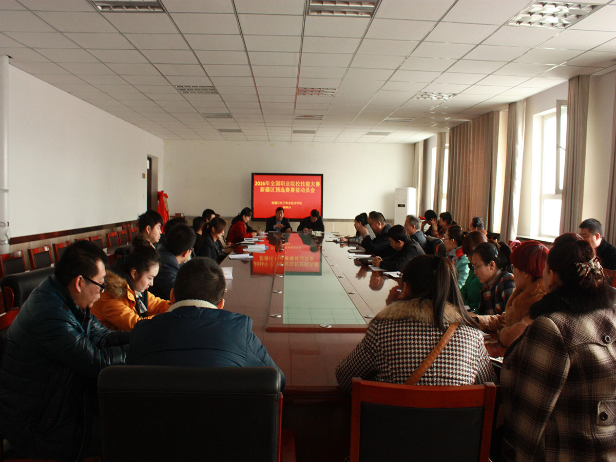 2016年3月11日上午,学院召开2016年全国职业院校技能大赛新疆赛区预选赛动员会议,各分院院长、教学副院长、各参赛项目指导老师参加了本次动员会,会议由教务处处长徐培江主持,王敏弦院长参加会议并做重要讲话。王敏弦院长强调技能大赛是强技能,彰显职业教育办学特色的重要内容,技能高低也体现学院各专业办学实力的重要指标,大赛不仅比学生,也是衡量学院教师含金量的重要因素,对学院发展具有重要意义。各分院领导、指导教师要高度重视,各项目要相互汲取经验,提前做好参赛工作,争取大赛成绩比去年有所突破。