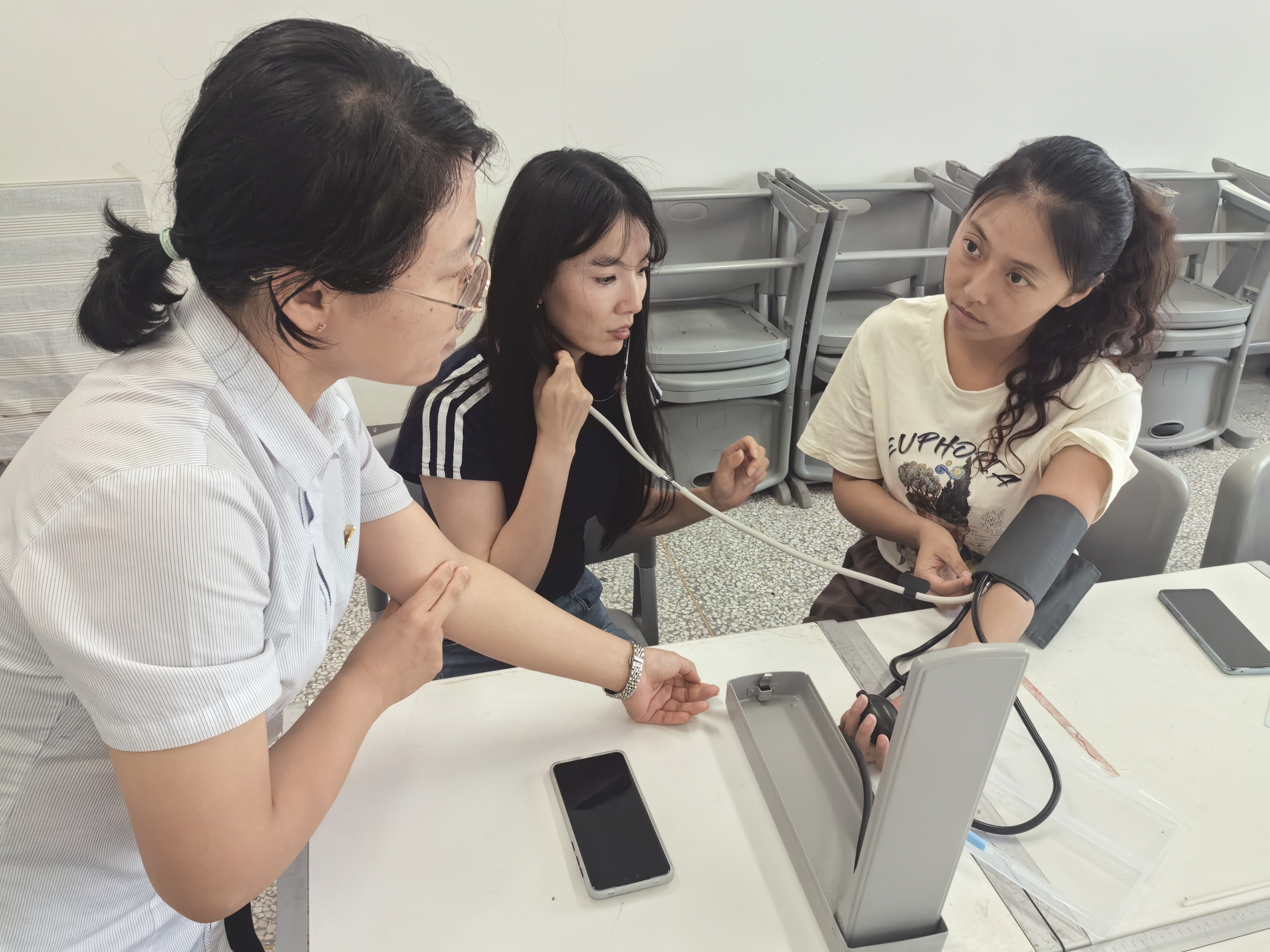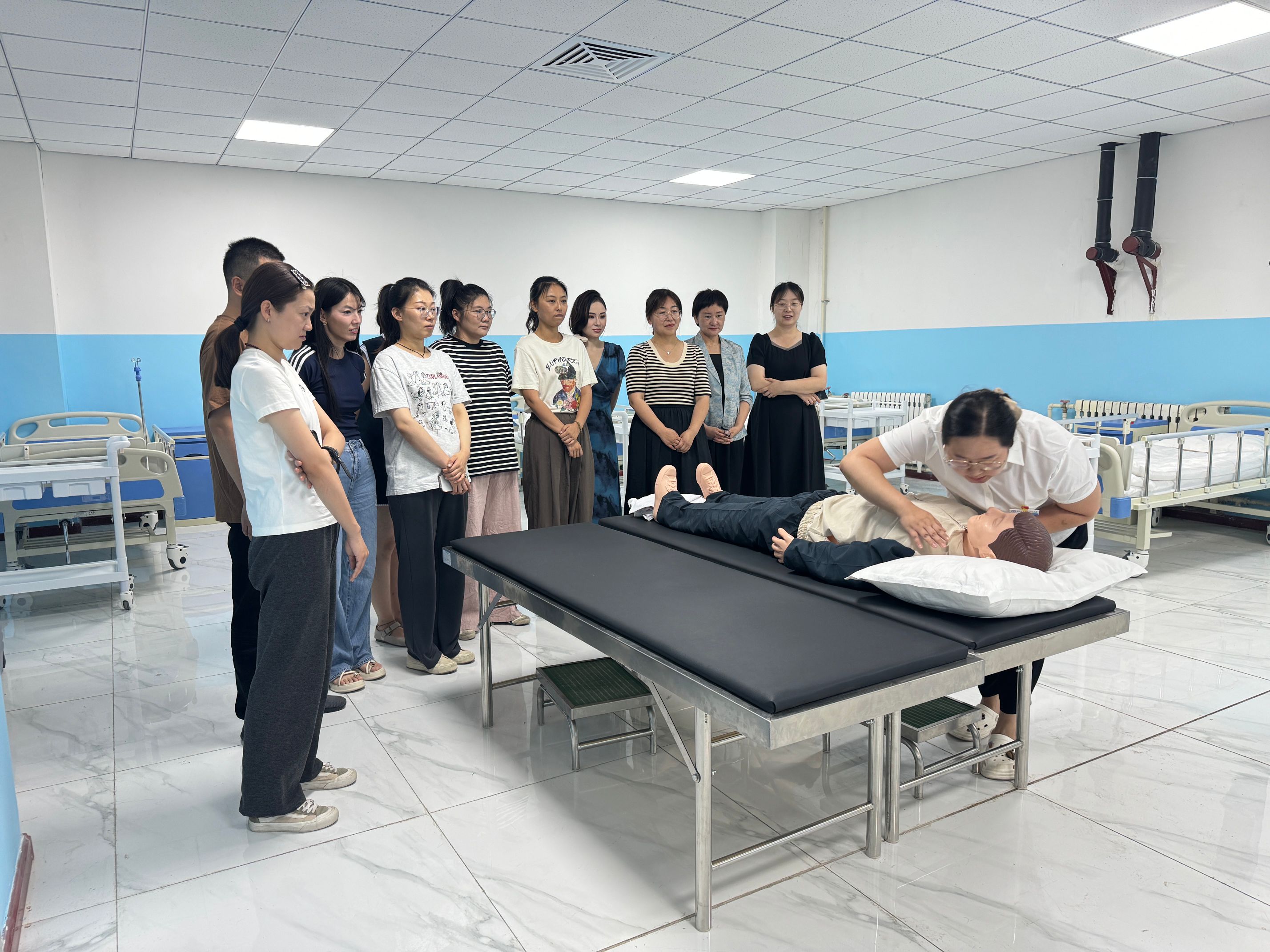 教师培训中,护理专业教师通过生动的演示和详细的讲解,向全体教师普及测血压、测血糖、测脉搏、海姆立克急救法及心肺复苏等关键护理技能。教师们通过分组练习、动手操作,既让护理专业教师的理论知识及临床经验用于实践教学,同时也锻炼了护理专业教师面对不同授课群体灵活掌握教学方法并更新教育理念。