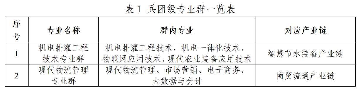 目前,学校内共有校级专业群6个,其中,食品智能加工技术专业群包含食品智能加工技术、食品检验检测技术、食品质量与安全3个专业;应用化工技术专业群包含应用化工技术、硅材料制备技术、化工安全技术3个专业;电气自动化技术专业群包含电气自动化技术、电力系统自动化技术、智能控制技术3个专业;建筑工程技术包含建筑工程技术、建设工程管理、工程造价、市政工程、道路桥梁工程技术5个专业;大数据技术专业群包含大数据技术、计算机应用技术、数字媒体技术、软件技术4个专业;机械制造及自动化专业群包含机械制造及自动化、工业机器人技术、智能焊接技术3个专业。