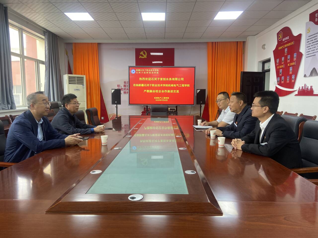 会上,双方围绕人才培养、岗位对接及合作模式深入洽谈。副院长刘振华表示,学校始终将服务区域产业发展作为办学重要方向,机械电气工程学院的专业建设成果与企业人才需求的契合是产教融合的关键。学校高度重视与石河子首创水务这类行业龙头企业的合作,将全力支持双方在人才培养、技术攻关等领域的探索,推动教育资源与企业需求深度融合,确保合作落地见效。辛延波书记介绍了学院的专业特色,指出机电一体化技术、电气自动化技术等核心专业,紧密对接区域装备制造与能源电力产业需求,已构建“教学+实训+就业”一体化培养体系,为区域内企业输送了大量高技能人才。王振江董事长表示,作为石河子环保领域龙头企业,公司目前面临技术骨干年龄偏大、新生后备力量不足的挑战,亟需懂设备运维且具备自动化控制能力的复合型人才,认为学院专业设置与企业岗位需求高度契合,期待通过共建 “订单班”、联合技术攻关实现人才精准对接。