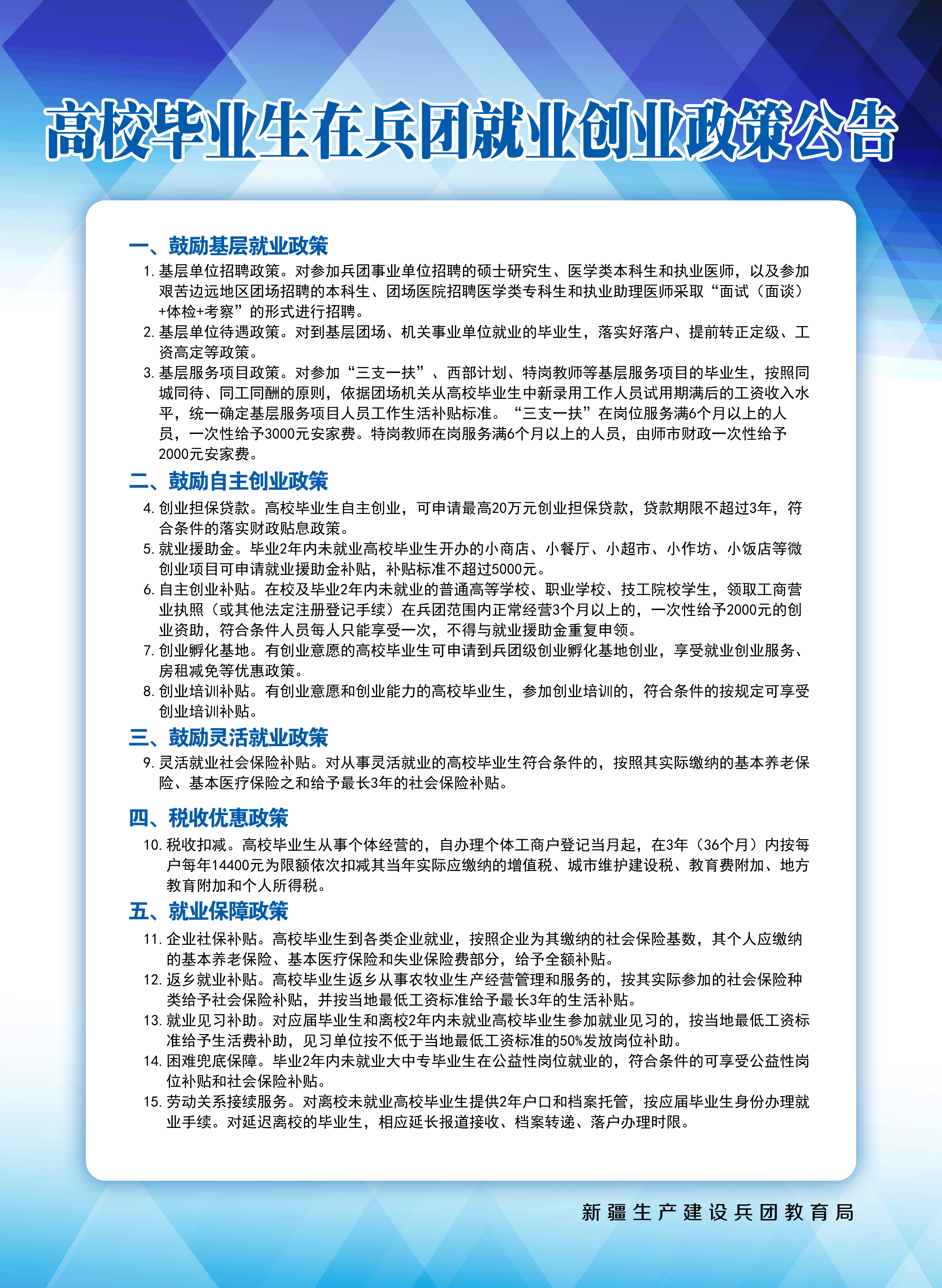 新疆生产建设兵团就业创业政策公告