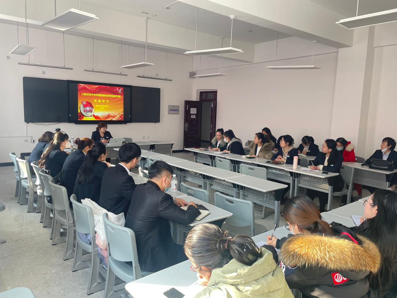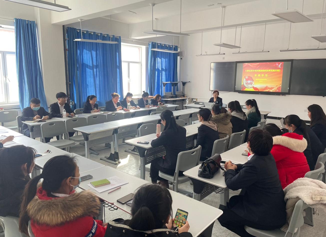 3月1日邀请了团委蒋小玉书记为全体班主任开展《八师石河子市共青团组织改革实施方案》专题学习。为提高班主任班团管理经验,带领各位班主任了解了团、团徽、团旗、入团条件、团员必须履行义务、团员享有的权力、党与共产主义共青团的关系等。让班主任了解到怎样进行班团管理,什么是班团一体化,如何做到入团标准严格细致,使推优入团制度能够普遍落实,新发展团员质量明显提升。