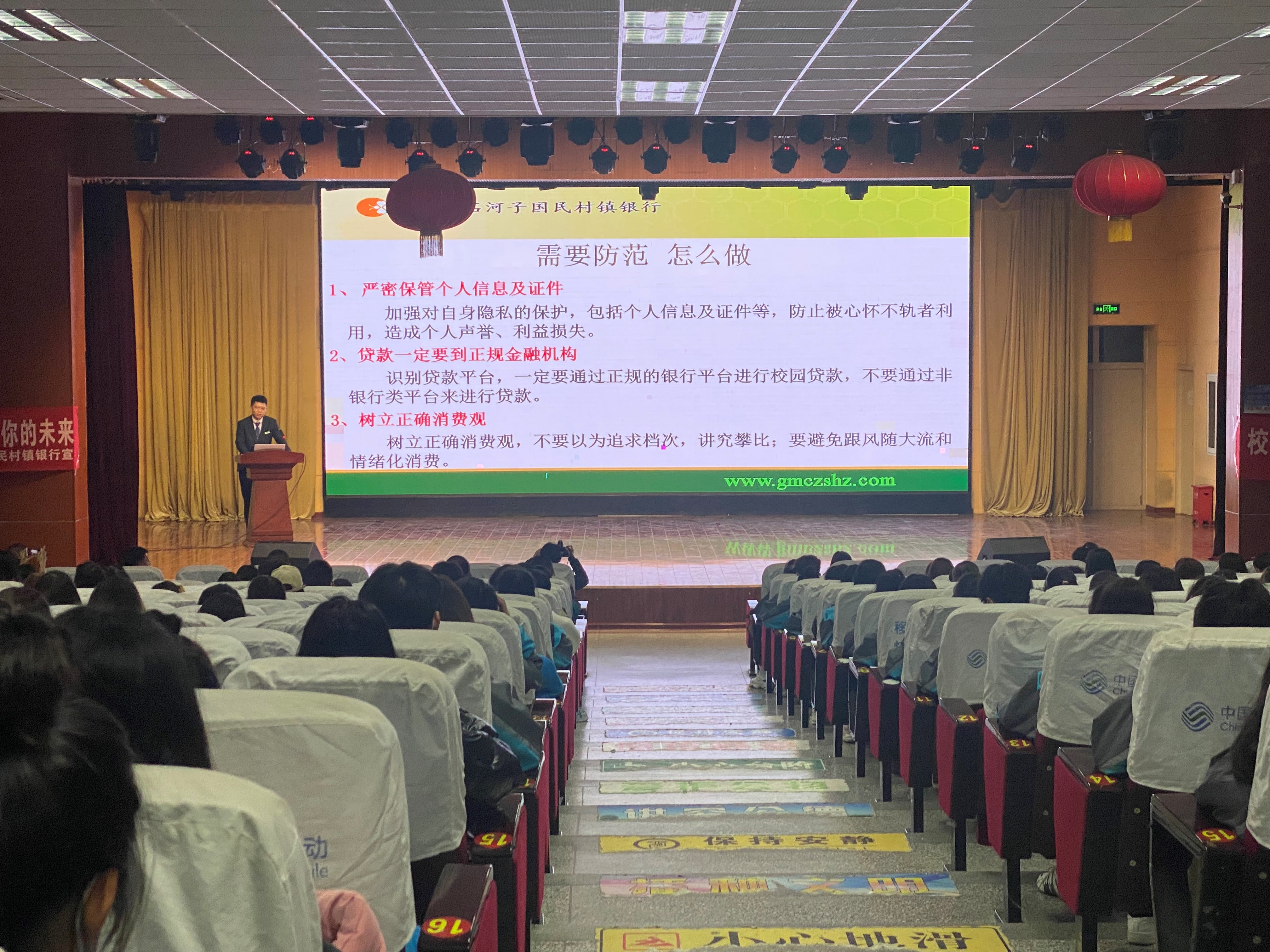 国民村镇银行工作人员通过视频和讲稿的形式,开展了以“警惕‘网’住你的青春,‘贷’走你的未来”为主题的宣讲,号召同学们树立正确理性消费观,自觉远离网络借贷,规避盲目消费风险以及如何防范非法“校园贷”。
