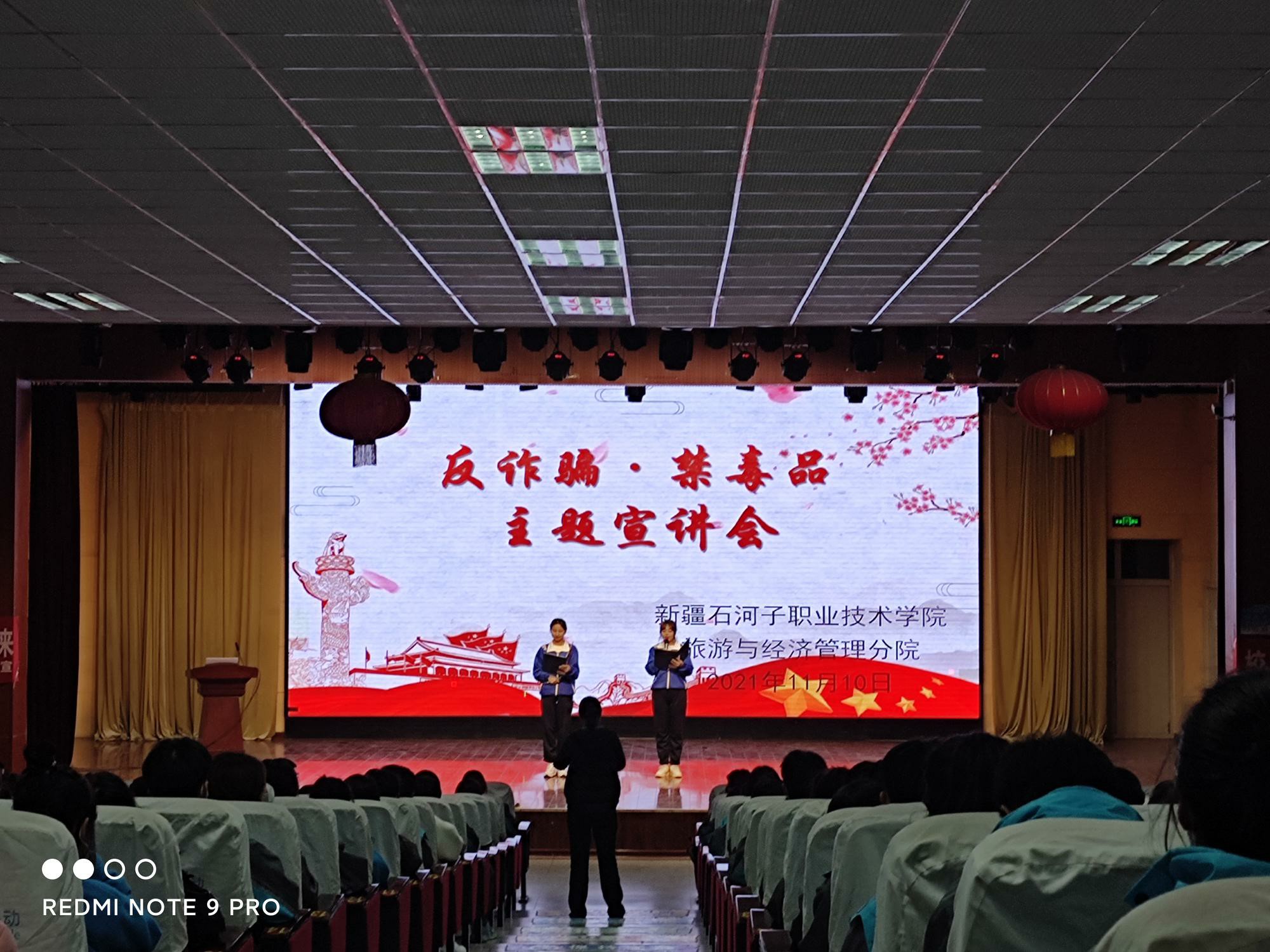 为提高同学们的安全防范意识,树立理性消费观念,加强反诈骗、禁毒的宣传教育力度,2021年11月10日晚八点经贸分院在综合楼四楼举办反诈骗·禁毒品主题宣讲活动。本次活动特邀东三路派出所民警、反诈中心民警以及国民村镇银行工作人员对我分院进行预防电信诈骗,远离毒品的宣传教育,学院保卫处杨春处长、分院党博文书记、学管老师以及48个班级的班长、团支书和部分班级学生共计200余人参与了此次活动。