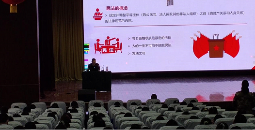 本次讲座的讲师薛战赢法官首先向同学们介绍了“民法典”的由来及其概念,使在场师生深刻感受到了“民法典”在我们日常生活中的重要性,之后他在讲座中提出“民法典”是与老百姓联系最紧密的法律;人的一生不可能不接触民法;“民法典”是万法之母等观点,生动形象的让在场的师生全面了解到了什么是“民法典”,“民法典”的作用究竟是什么等相关知识,讲座最后他衷心的希望同学们在今后的学习、生活及其工作中能够知法、懂法、守法,并要学会运用用正确的方法维护自身的合法权益,勇敢的去抵制社会的不良风气和违法犯罪活动。