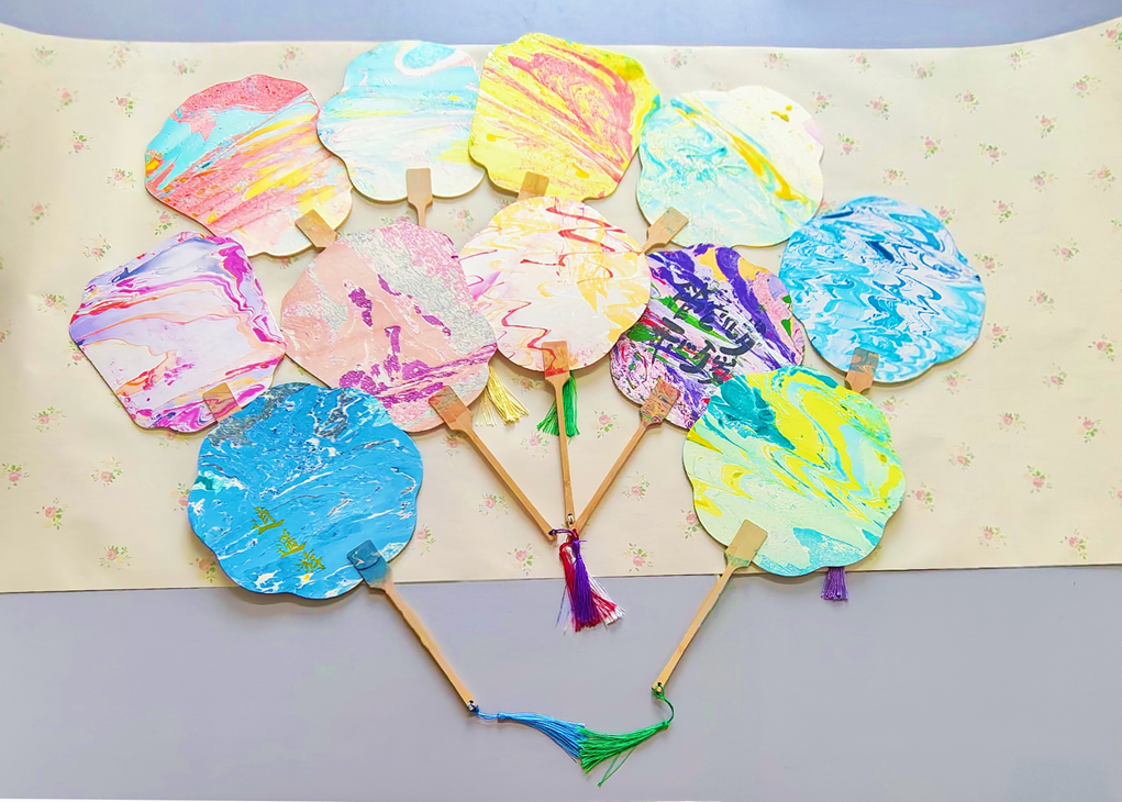 课上,王若雨老师为学生详细讲解了战国漆器纹样、唐代金银平脱漆扇等珍贵文物影像,同时结合专业视角,解析了漆扇从文人雅物到文化创意产品的转型案例,并以故宫文创漆扇礼盒为例,剖析传统工艺与现代设计、数字营销的融合路径。实践环节中,王若雨老师为学生们准备了十多种漆材和扇面,认真指导每一位同学逐层裱褙,制作出薄如蝉翼却坚韧如革的漆面基底。在若雨老师的指导下,学生们制作了以“红、黄”为底色的传统样式漆扇和“蓝、绿”为底色充满青春气息的新式漆扇。学生们纷纷以视频、图片等形式在网络平台上宣传展示文创作品,并分享自己的创作过程和感悟。