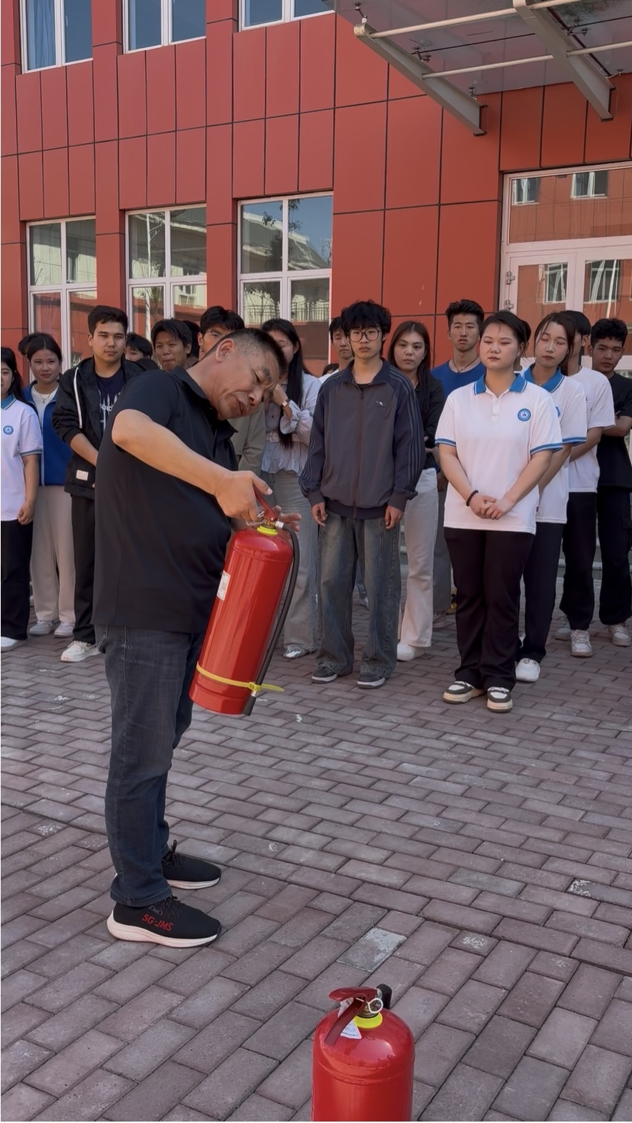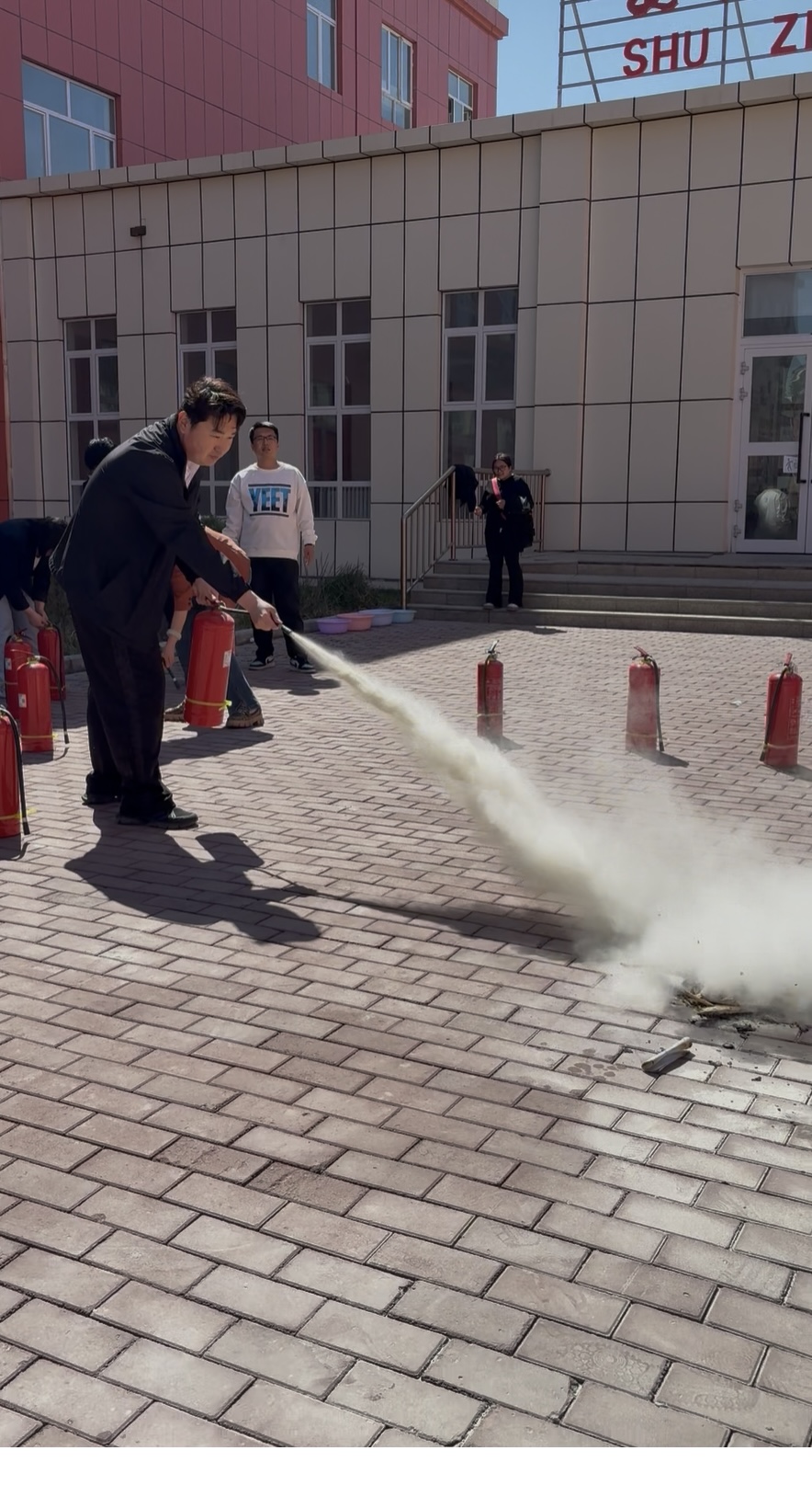 数字商贸学院高国斌老师向在场师生详细讲解了火灾的类型、常见起火原因以及不同类型灭火器的适用场景。并结合校园生活中可能出现的火灾隐患,着重介绍了干粉灭火器、二氧化碳灭火器的操作要点,通过 “提、拔、握、压” 四字口诀,将灭火器使用步骤进行高度提炼,便于师生记忆。数字商贸学院党支部书记党博文为师生详细讲解了各类消防器材的使用方法,现场演示了如何正确使用灭火器。师生认真聆听、仔细观察,部分教师代表通过实操演练,掌握了扑灭初期火灾的技能。为确保每位师生都能掌握操作技能,此次演练准备了多个灭火器,让更多师生有机会亲身体验灭火器的使用,在实践中加深对消防知识的理解和运用。