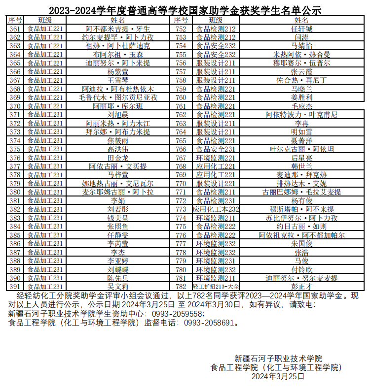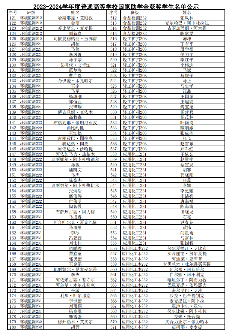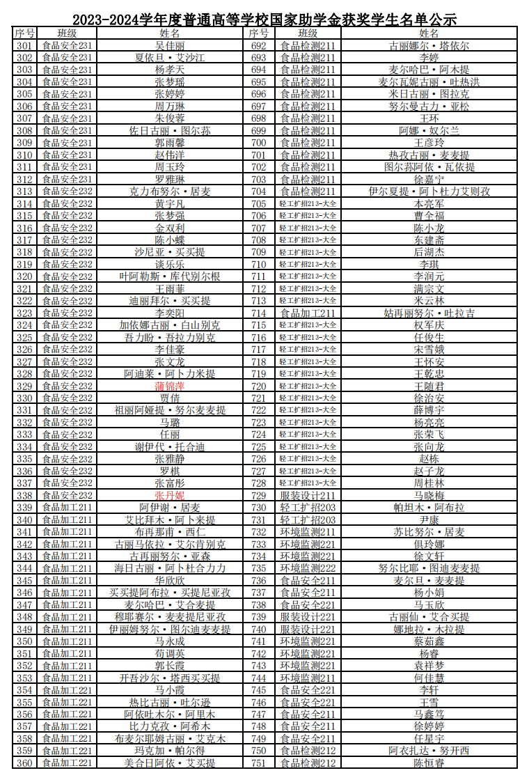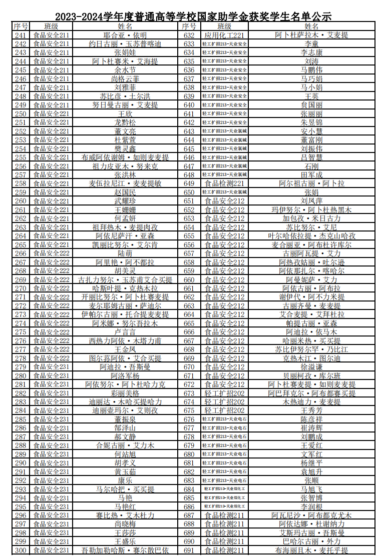 2023-2024学年度普通高等学校国家助学金获奖学生名单
