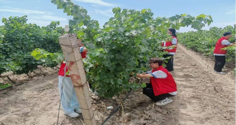 绿色发展倡导团首站深入玛纳斯葡萄田,师生们顶着烈日投入疏果、修剪工作。分工协作间,指尖在藤蔓灵活穿梭,亲身体验果农辛劳,更掌握了葡萄整枝、病虫害防治等实用技能。在中兴尼雅葡萄酒股份有限公司,在生产车间实地观摩发酵罐运作、果汁压榨、无菌灌装等全流程工艺,并与技术人员深入交流酿酒原料筛选、发酵温度控制等专业问题,贯通田间种植与工业加工知识,构建起从“葡萄藤到葡萄酒”的完整认知体系。