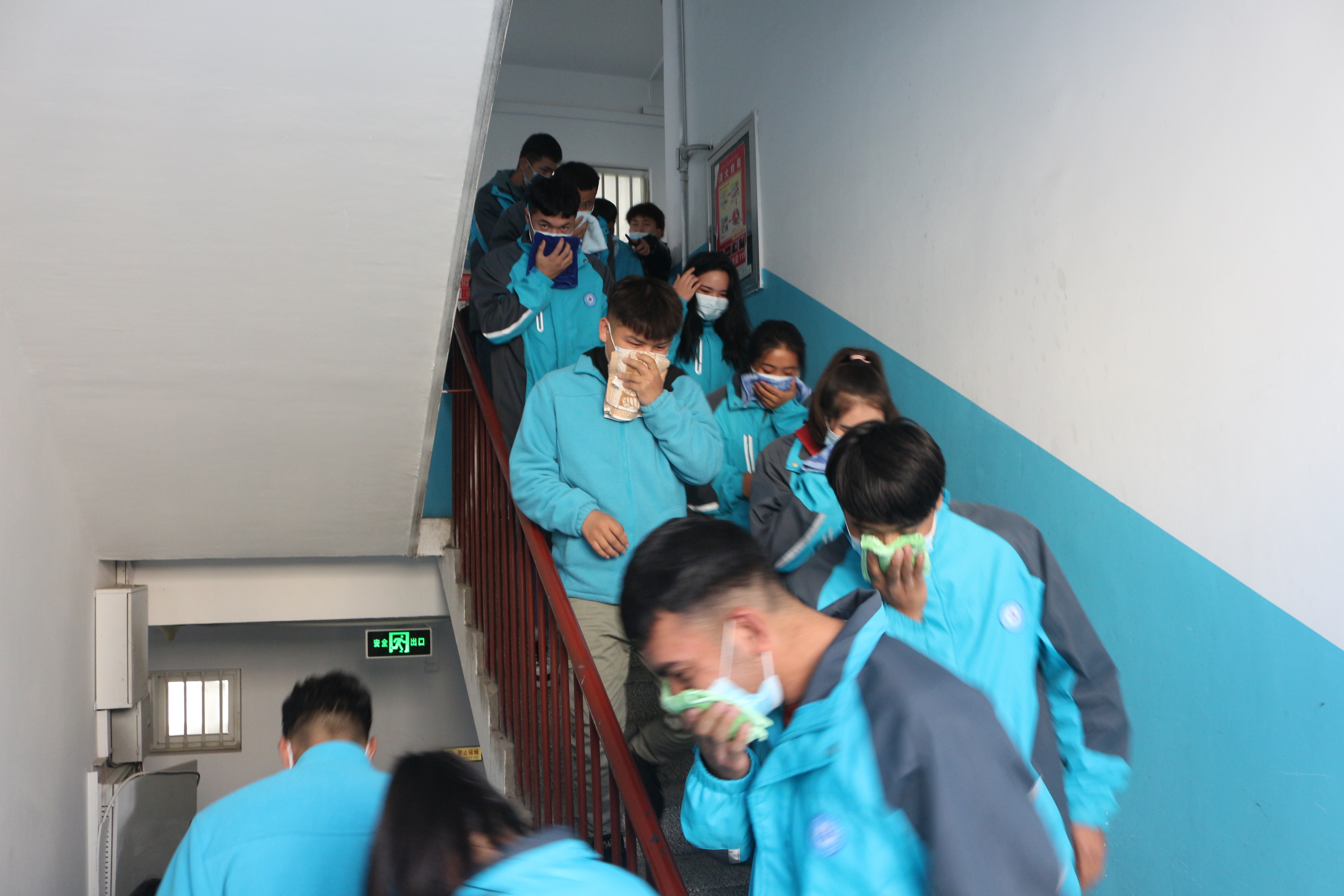演练前,学生会成员认真的向每个班指出逃生通道和顺序并告诉大家疏散时不乱、不慌,注意安全。学生会成员负责本次演习的警报铃声,15点05分学校拉响警报,学生会成员迅速组织学生排队疏散,老师们也提前在自己的任务点配合疏散学生。所有学生弯腰,低姿,一手用毛巾捂住口鼻,一手扶墙或栏杆,沿着指定楼梯口快速有序撤离,来到前楼国旗杆下安全地带,共耗时3分钟。 随后按班清点人数,由各班负责人向演练负责人报告各班疏散到位情况,并最终确认分院全体师生安全疏散完毕。