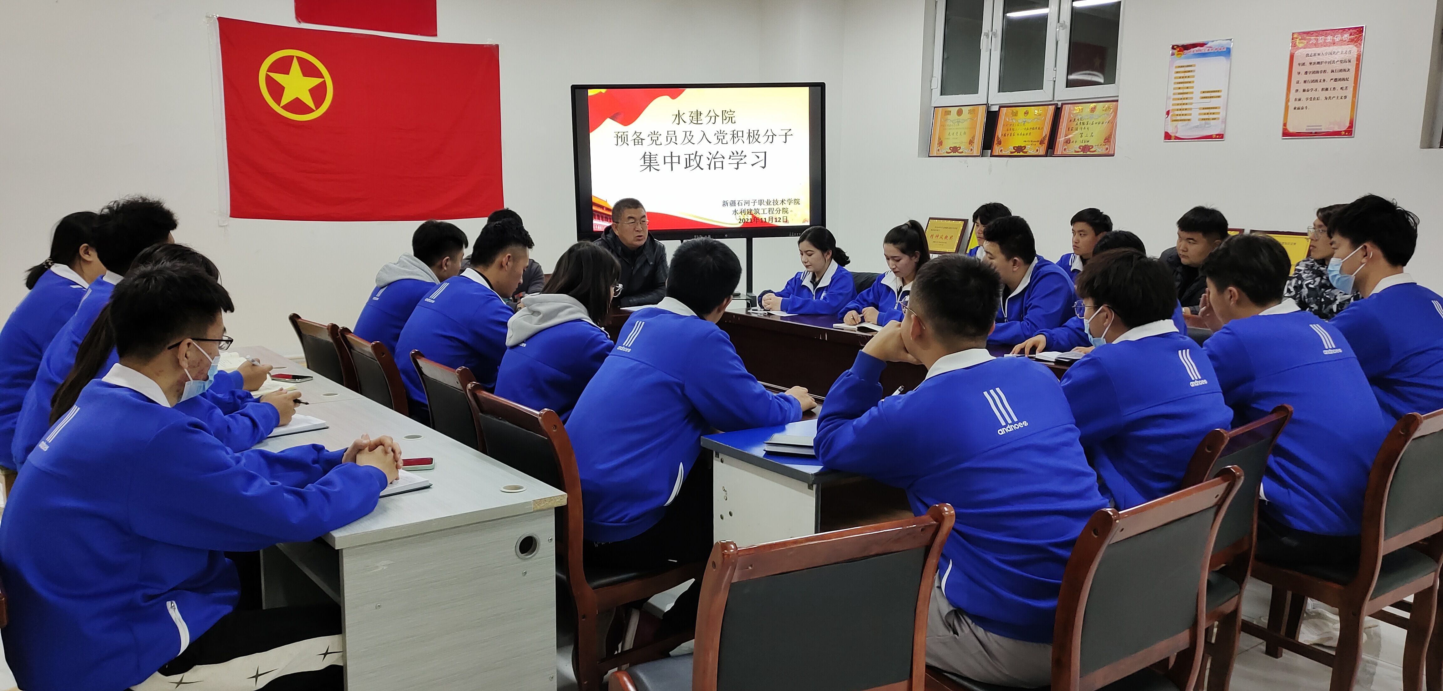 2021年11月12日,水利建筑工程分院党总支组织在二期卫生楼003教室组织19级和20级的入党积极分子学习学习党的十九届六中全会精神。学习由党总支书记俞峰同志主持。