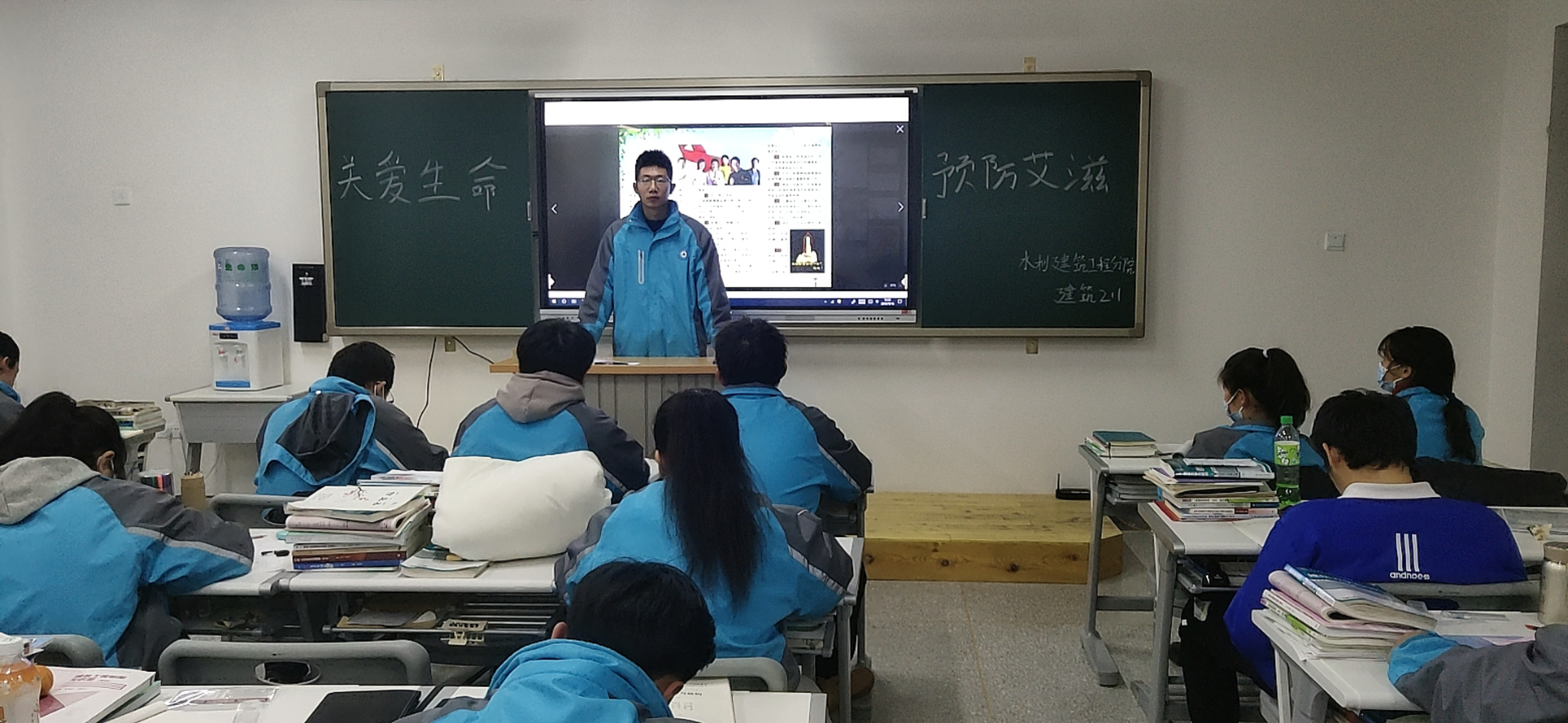 在建筑工程技术211班级的主题班会上,宋梦豪同学向同学们讲解了艾滋病的危害、防控的方法和意义,并号召大家不要歧视艾滋病人。随后组织同学们观看艾滋病的宣传教育片《生命的断层》。最后,通过对同学们进行了艾滋病知识知晓率测试,让同学生们深刻地了解了艾滋病的危害,了解了有效防治艾滋病的具体措施及预防艾滋病工作的重要性。