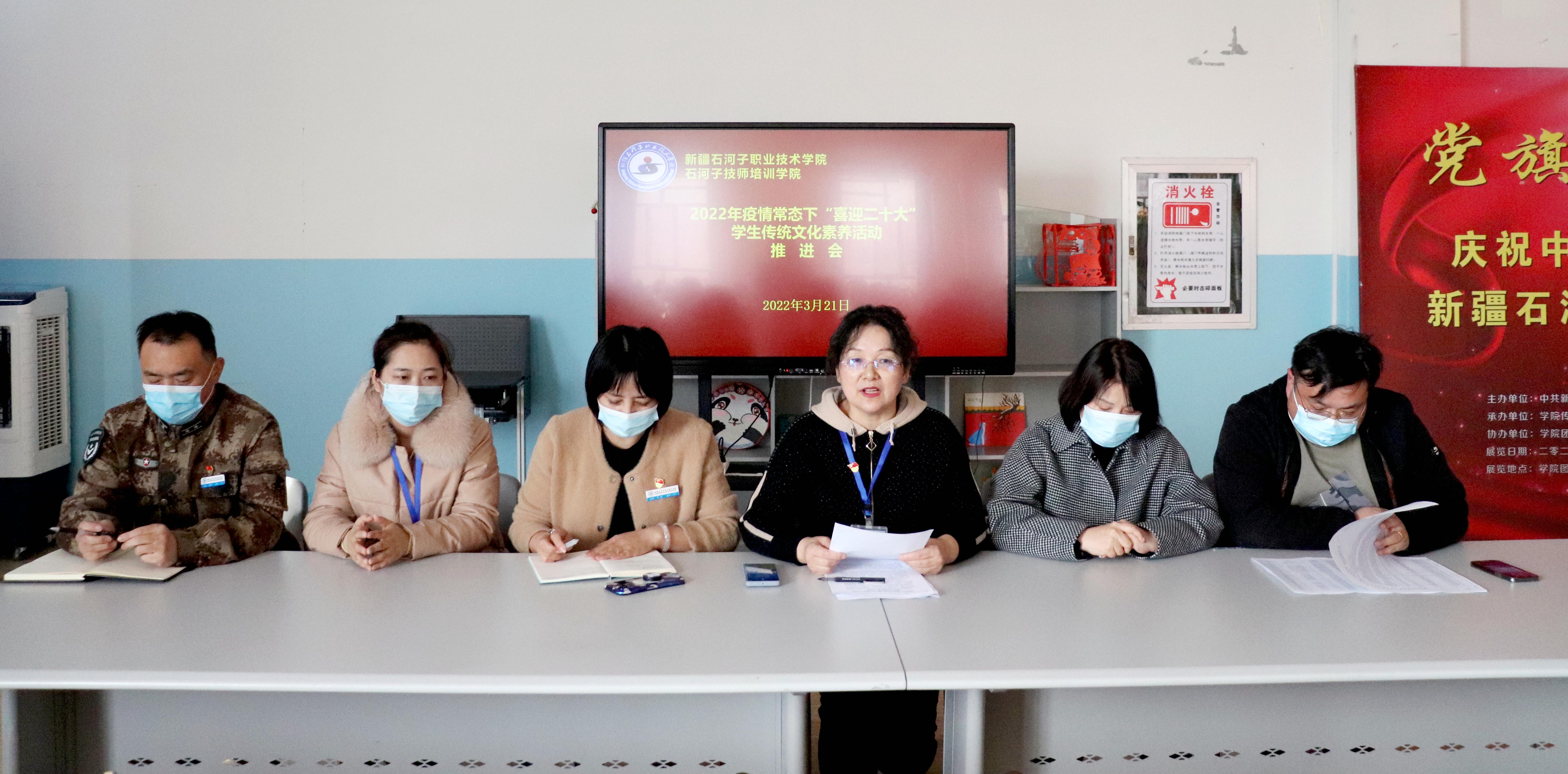 陈建红老师追根溯源,从中国传统文化视角讲到传统文化素养大赛对2019年成立的学院传统文化素养工作室的基本情况进行全面介绍。并鼓励在座的各位要紧紧围绕学院党委大思政思路,结合时间表和路线图,合理安排时间积极参与学院、兵团级传统文化素养大赛,大家共同努力将本次活动落实、落细,希望籍素养大赛的平台把校园传承优秀传统文化活动做起来、动起来、活起来、火起来。