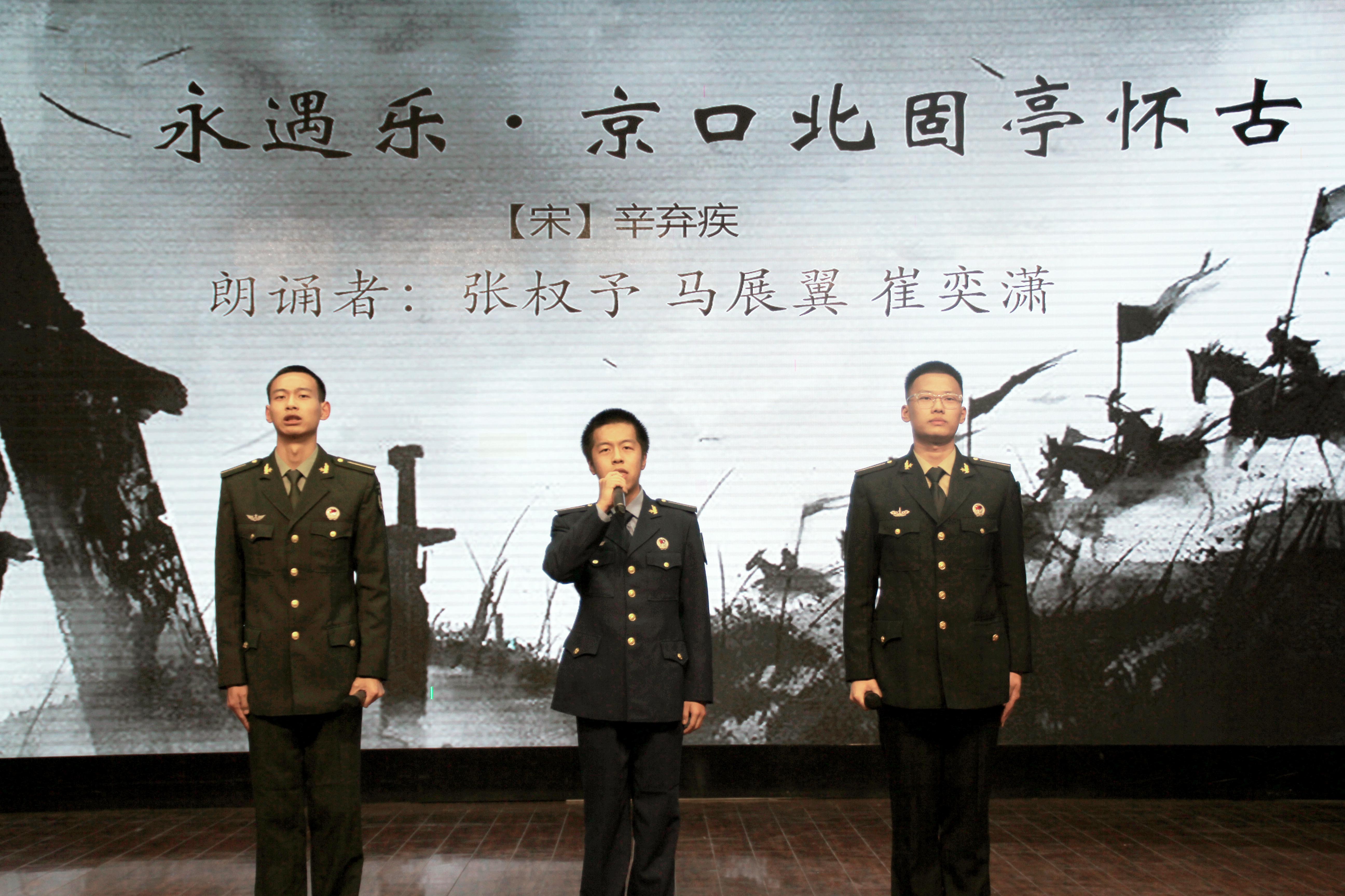随着一首宋代豪放派词人辛弃疾的《永遇乐•京口北固亭怀古》的朗诵,现场的氛围达到高潮,这是由学院士官生参赛团队朗诵。词的开头从“千古江山”起,喷薄而出,气势雄浑,将词中豪情壮志展现得淋漓尽致,廉颇自拟,慷慨壮怀,如闻其声。由此足以看出士官生们对报效国家、接受时代重任的决心。