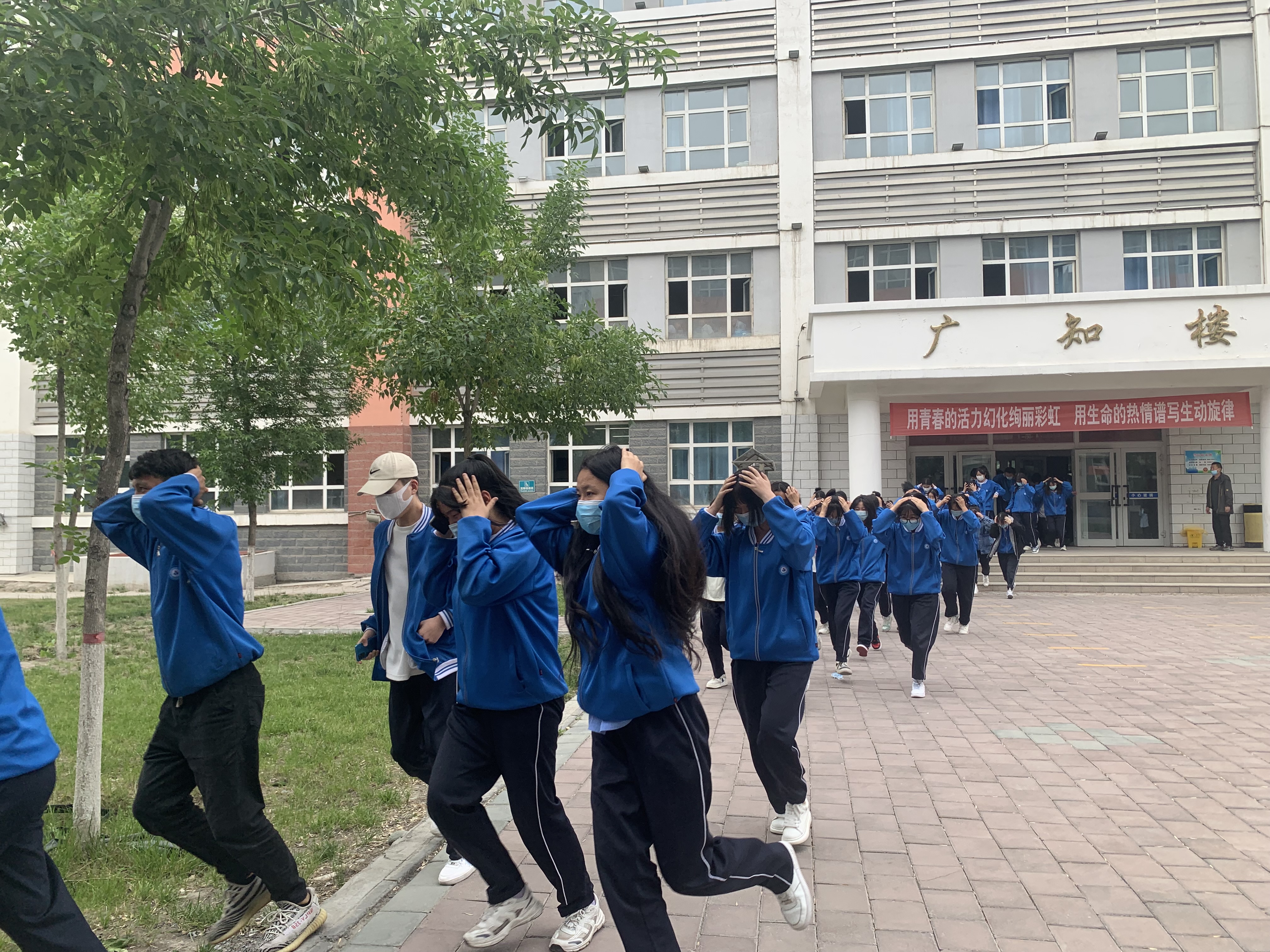 下午6点整,伴随着一声拉长的警报声响彻学校。听到危险信号,同学们立刻以最快速度躲在各自教室的桌子底下,或快速移动到墙角、三角区域抱头下蹲。当警报声再次响起,老师立即组织同学们双手抱头,快速有序沿着指定路线撤离。到达安全地点后,各班班长清点人数并进行上报。在本次疏散演练中分院1404名学生80位老师共计用时3分15秒,虽然过程紧张,但是井然有序,没有疏漏一个学生,没有出现碰撞和踩踏事件,达到预期效果。
