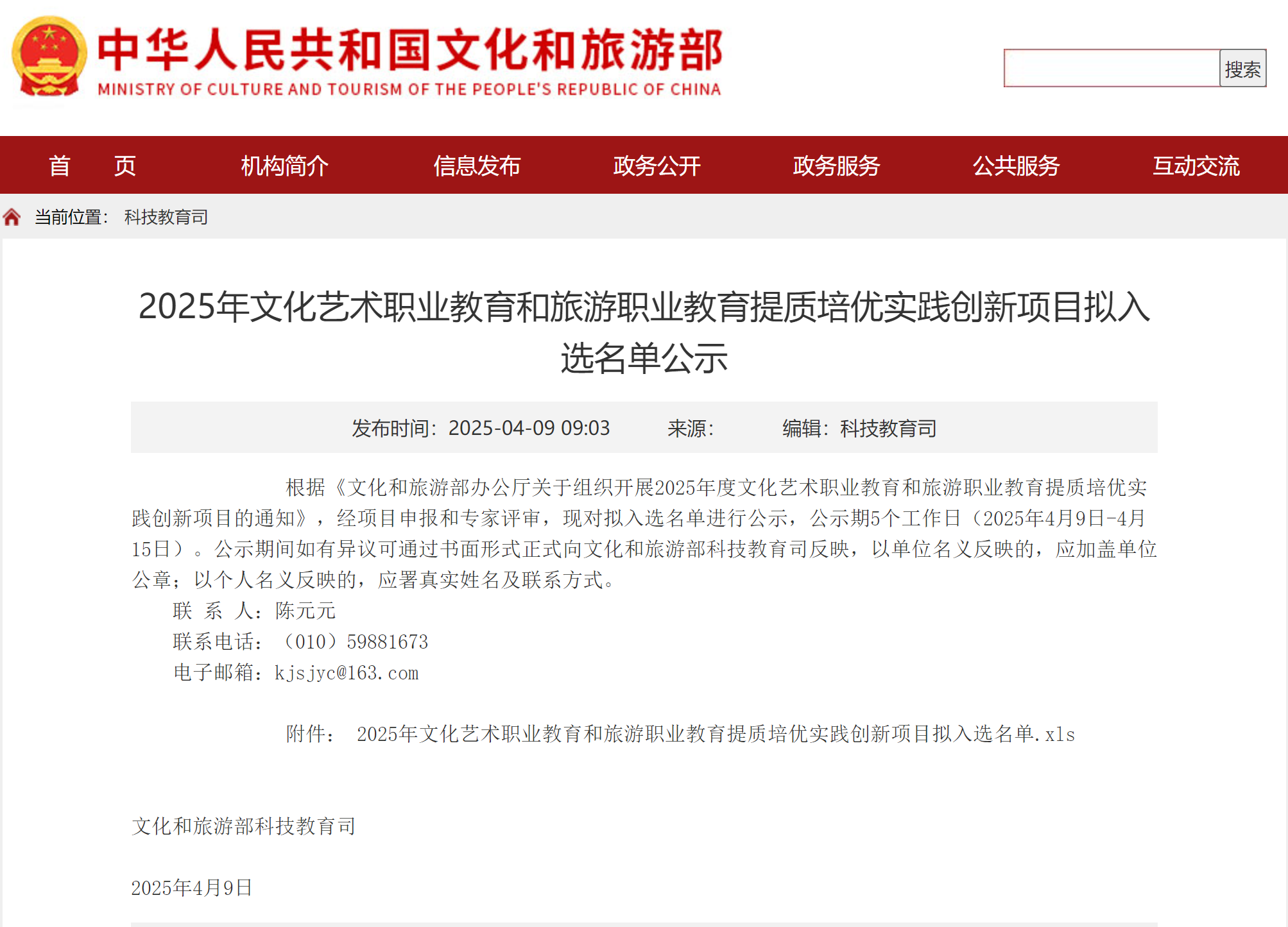 (杨静静 报道)近日,国家文化和旅游部官网发布“2025年文化艺术职业教育和旅游职业教育提质培优实践创新项目”公示名单,我校现代服务学院申报的《剑犁交响石城志 星燧不息未来书——新疆石河子研学旅游课程体系研发设计与实施》项目成为最终入选的40个项目之一。此次入选具有双重里程碑意义:既是学校首次获评该类国家级项目,更使我校成为聚焦“研学旅游课程体系研发设计与实施”方向并成功入选的新疆唯一院校。