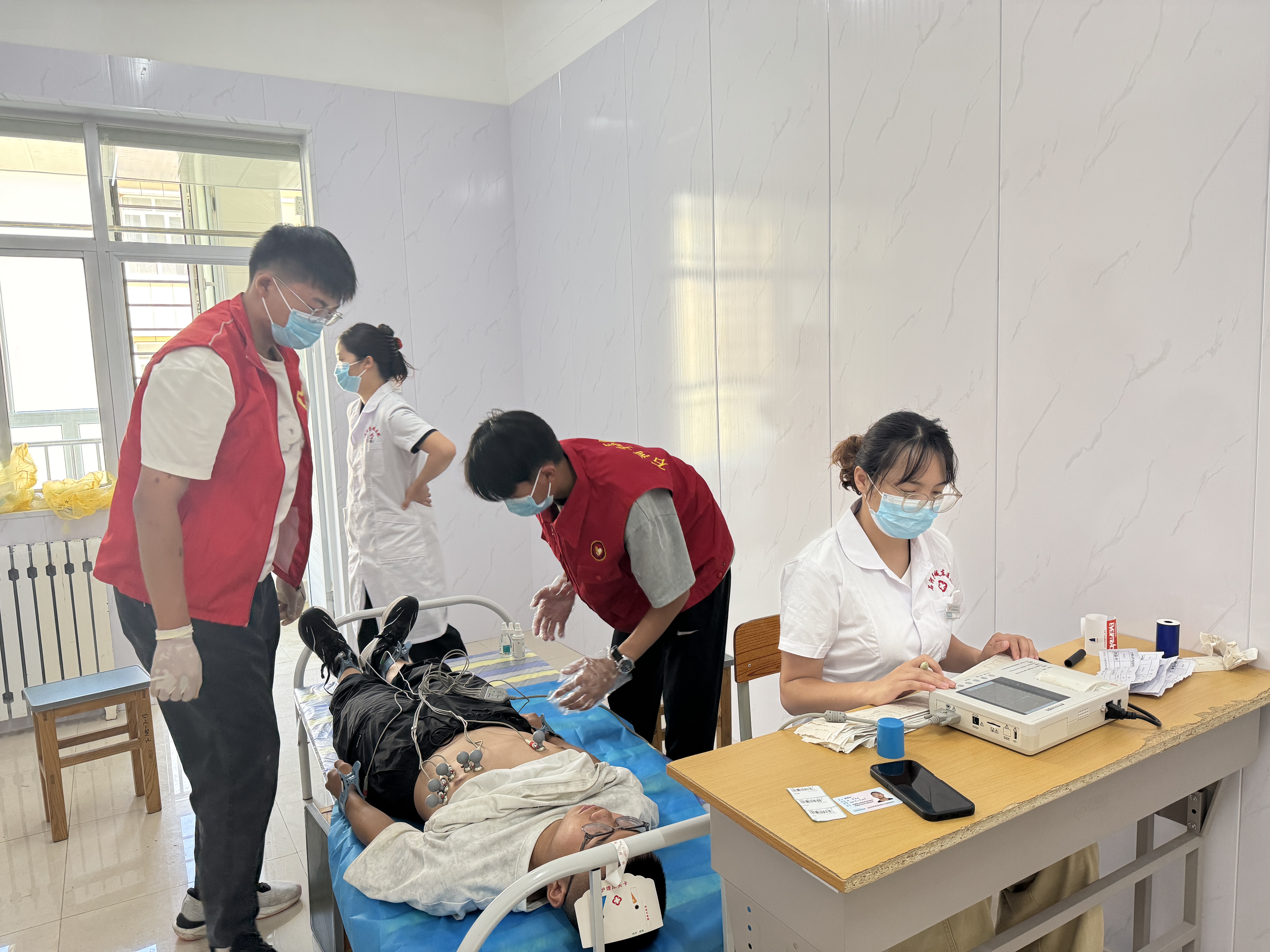 体检现场,师生志愿者们迅速投入到服务中。在现代服务学院党支部书记俞峰的统筹协调下,志愿者们分工清晰、配合默契:有的协助医护人员核对信息、登记资料,有的引导市民按流程完成血常规、心电图等各项检查,还有的主动上前帮扶残疾人等特殊群体。他们用耐心的解答消除市民的疑虑,用细致的服务保障体检工作高效推进。此次志愿服务累计协助430余名市民顺利完成体检,不仅有效缓解了医院的服务压力,更让忙碌的身影成为现场一道温暖动人的“青春风景线”。