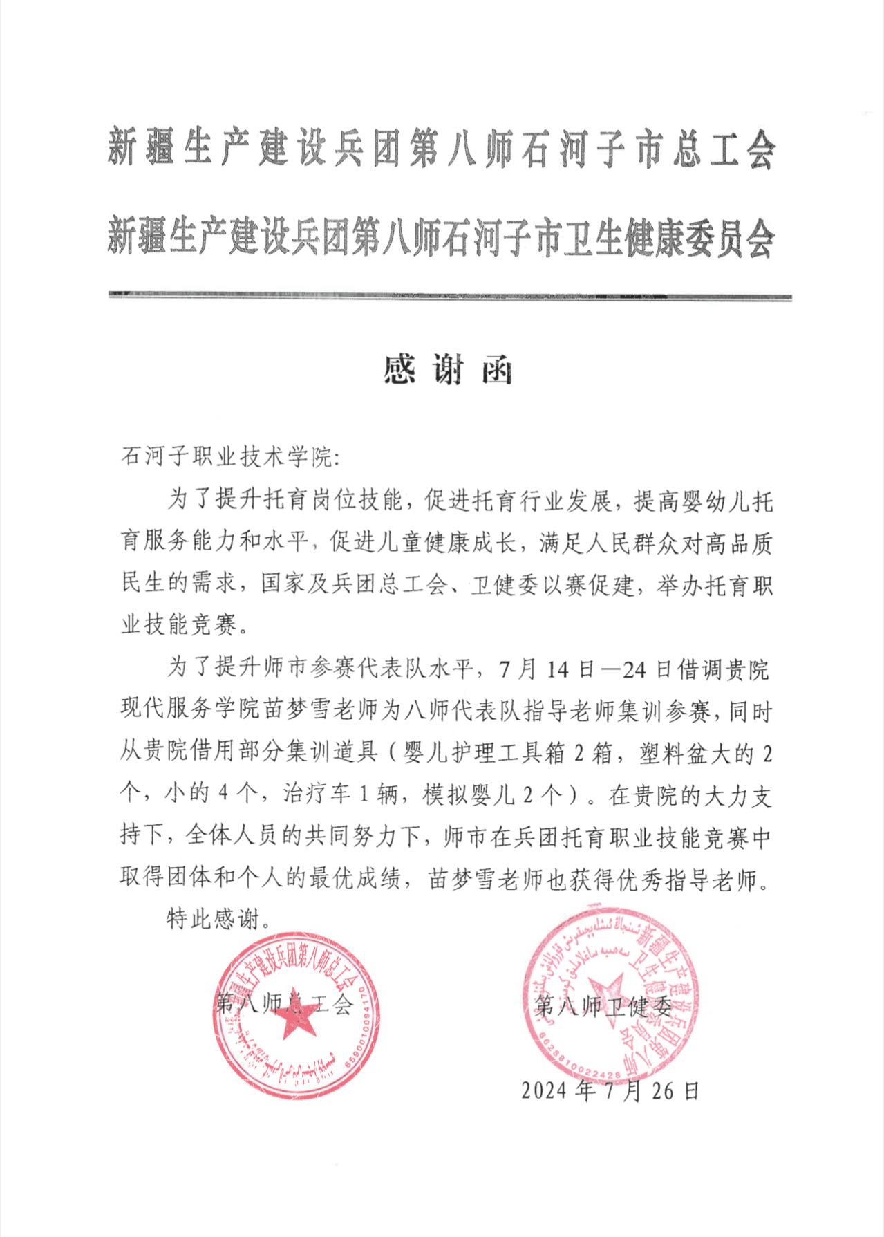 新疆生产建设兵团第八师石河子市卫生健康委员会 感谢函