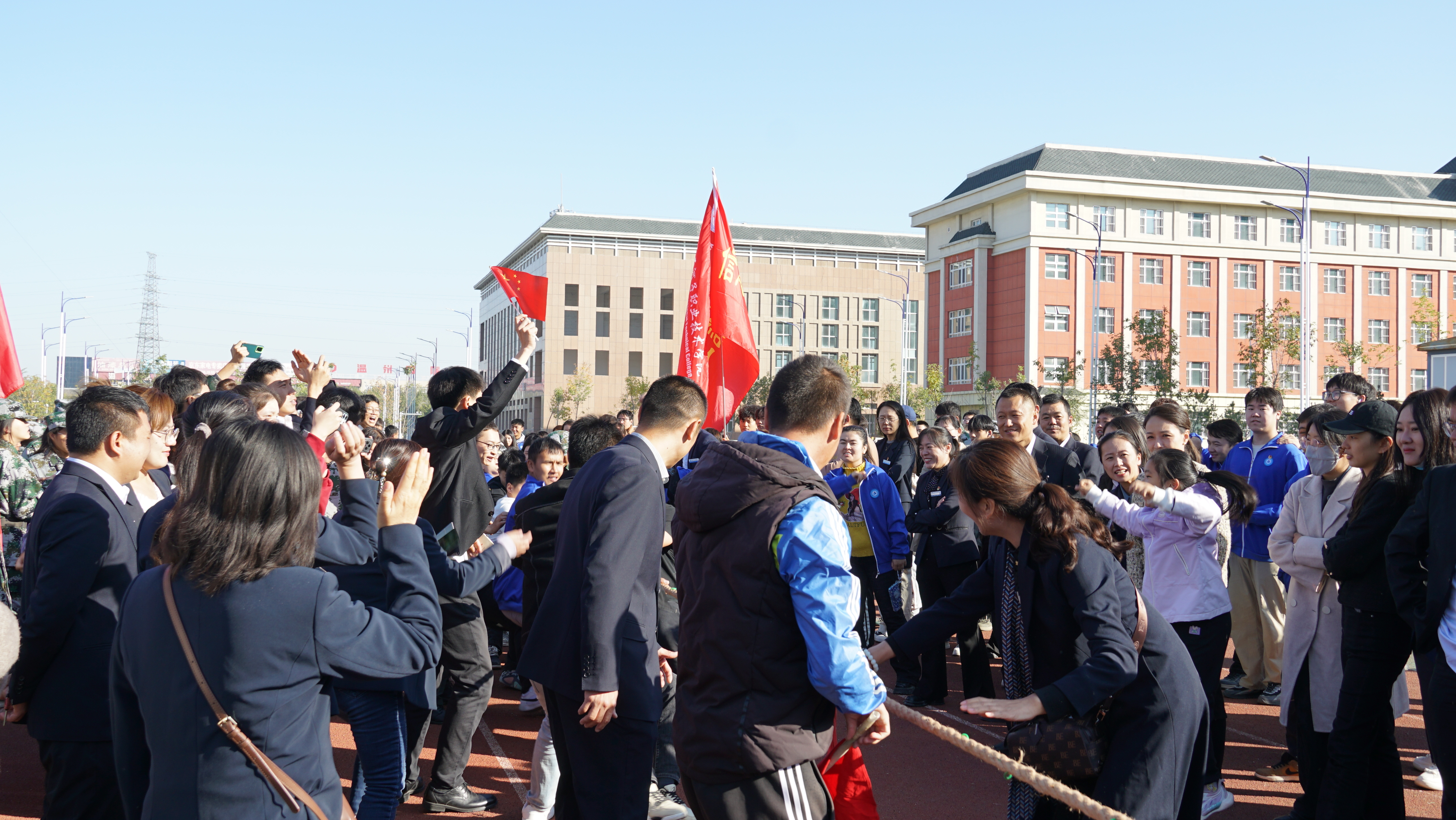 上午10时,升旗仪式在雄壮的国歌声中拉开序幕,全校师生肃立,注视着五星红旗冉冉升起,共同表达对祖国的热爱与祝福。升旗仪式结束后,拔河比赛的哨声随即响起,为节日的校园增添了浓厚的喜庆氛围。第一场比赛在食品化工学院与现代服务学院的学生之间展开。双方队员都鼓足了劲,紧紧抓住绳子,脚蹬着地,身体后倾。食品化工学院的队员们配合默契,他们喊着整齐的口号,一步步将绳子拉向自己一方,最终赢得了第一场比赛的胜利。紧接着,第二场比赛在信息与通信工程学院与数字商贸学院之间进行。这也是一场激烈的角逐,信息与通信工程学院的选手们展现出强大的力量和坚韧的毅力,在你来我往的相持中,成功战胜数字商贸学院。