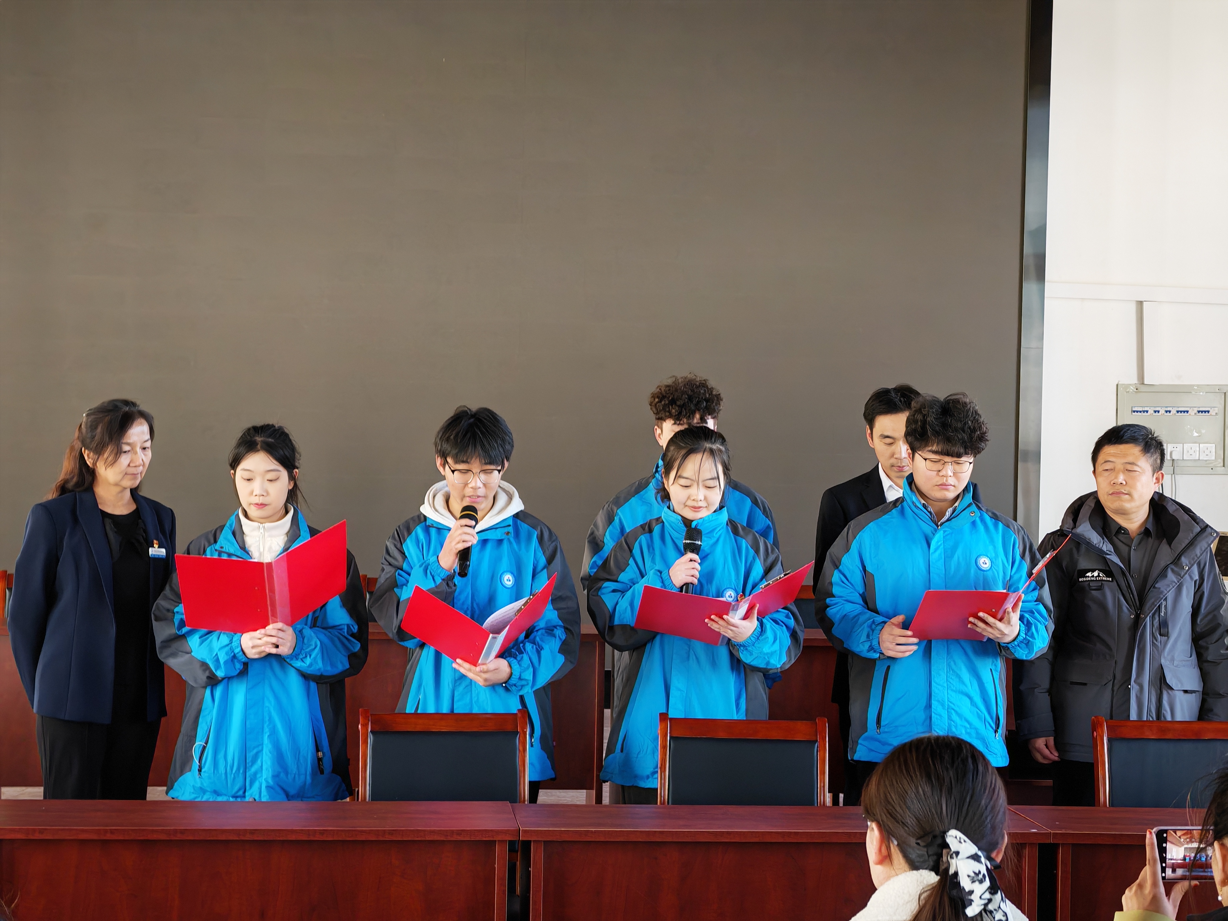 在军垦第一连门前,师生们在讲解员的带领下,开启了“重走垦荒路”徒步拉练。沿着先辈们的足迹,师生们深刻体会到了军垦先辈们的艰辛。一路上,讲解员生动讲述了“地窝子里的青春”等英烈事迹,并结合沿途的文物展陈,重现了那段艰苦激昂的岁月。在军垦第一连广场前,一场庄严肃穆的缅怀仪式拉开帷幕。全体师生整齐列队,奏唱国歌,随后集体默哀,表达对革命先烈的深切缅怀之情。团学干部与教师共同诵读《英雄》,激昂的诵读声在广场上空回荡。紧接着,党员同志们重温入党誓词,坚定了自己的使命担当。