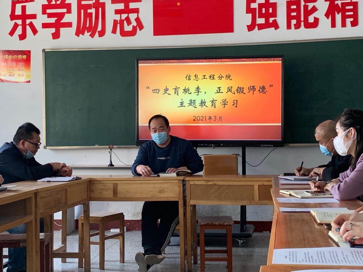 为进一步加强对“四史”的系统化学习,使我分院教师更加深入地理解和把握当前面临的新形势、新任务、新要求,明确当代教师教书育人的职责所在,2021年3月25日下午6点,信息工程分院在信息楼303教室召开分院管理及班主任培训会,会议由信息分院书记徐通主持,信息分院院长荣喜丰、副院长周鑫及分院全体教师参加了此次会议。