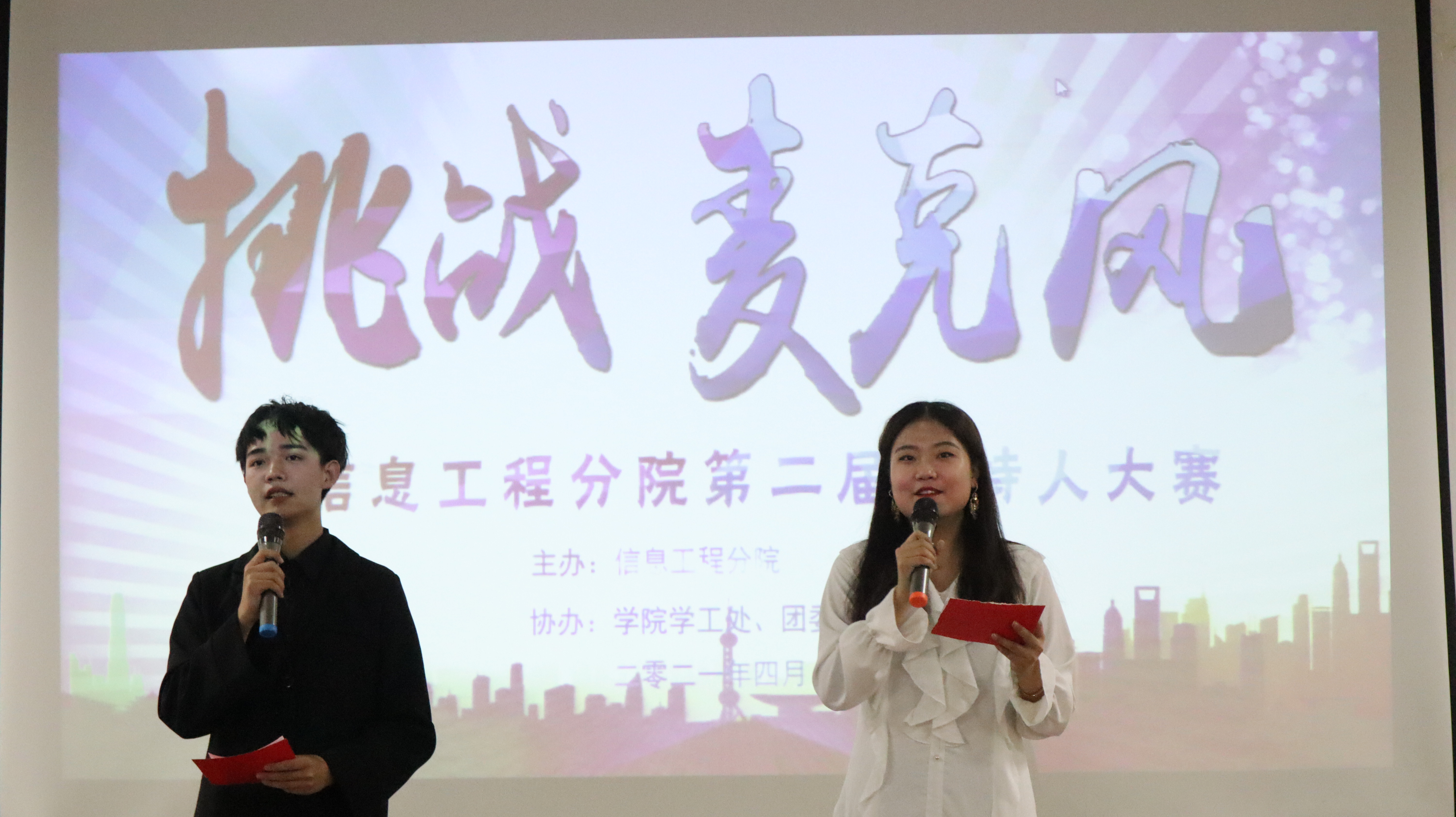 为了丰富同学们的校园文化生活,提升同学们的语言表达能力,锻炼、展示自身特长,给同学们提供一个展示自我风采的舞台,信息工程分院于2021年4月22日下午6点,在综合楼阶梯教室201举办了“挑战麦克风”第二届主持人大赛。