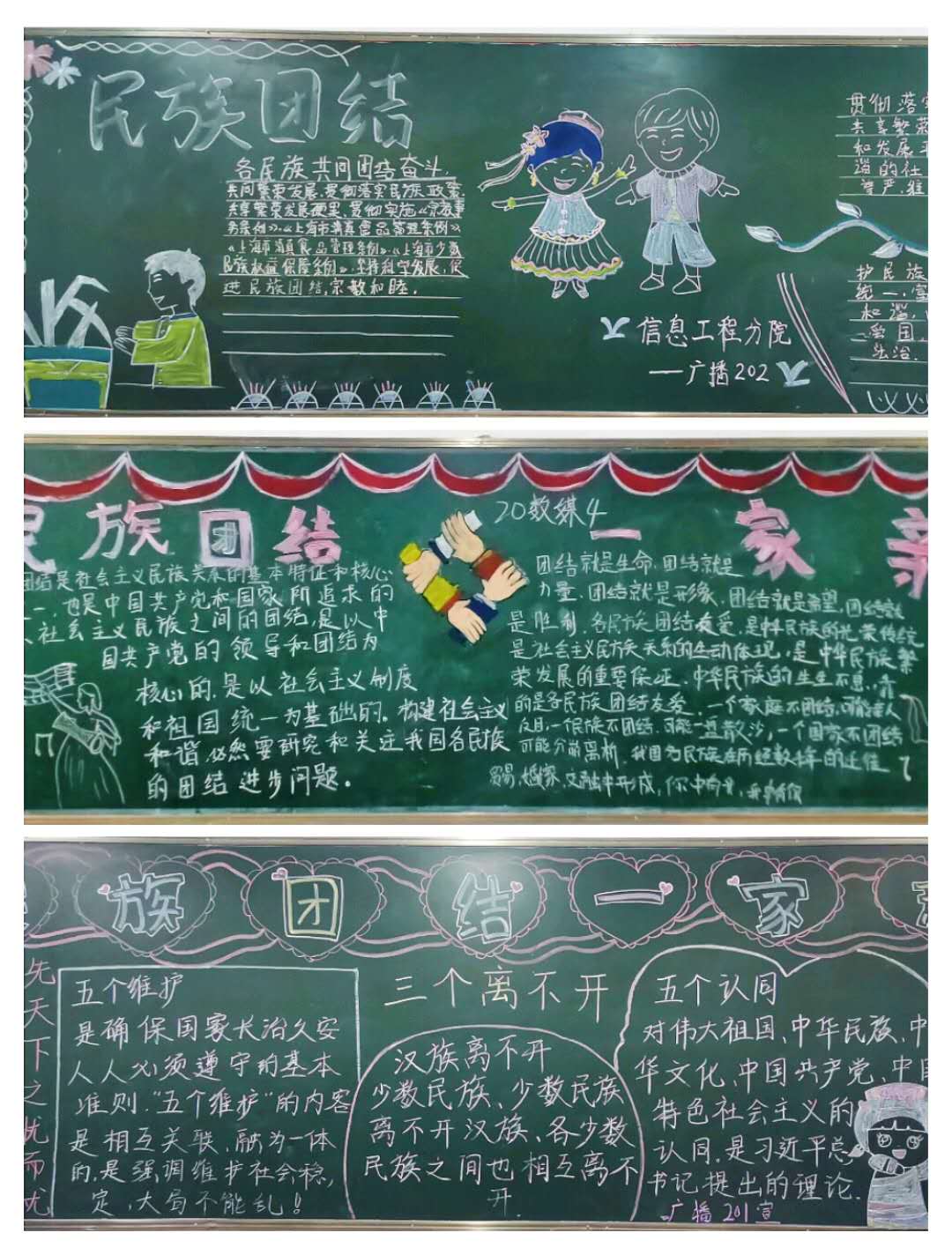 本次活动以主题班会、手抄报、黑板报和制作宣传栏等集中宣传的形式,大力宣传党的民族政策,民族团结的先进典型感人事迹。主题班会上,班委通过PPT宣讲的方式,呼吁同学们学习好:“四史”和“爱国主义教育”,并重点学习了“反邪教”和反对“三股势力”在校园的渗透,通过知识抢答和多种网络形式向同学们宣传和普及反邪教知识和民族政策及法律法规。同时,各班同学又以图文并茂的形式绘制了手抄报和黑板报,外宣部成员制作了宣传栏,通过多样化教育手段,积极营造崇尚科学,反对邪教的校园文化氛围,倡导、传播科学思想,普及科学知识,用科学的方法学习,提高了全体师生认识和抵制邪教的意识与能力。