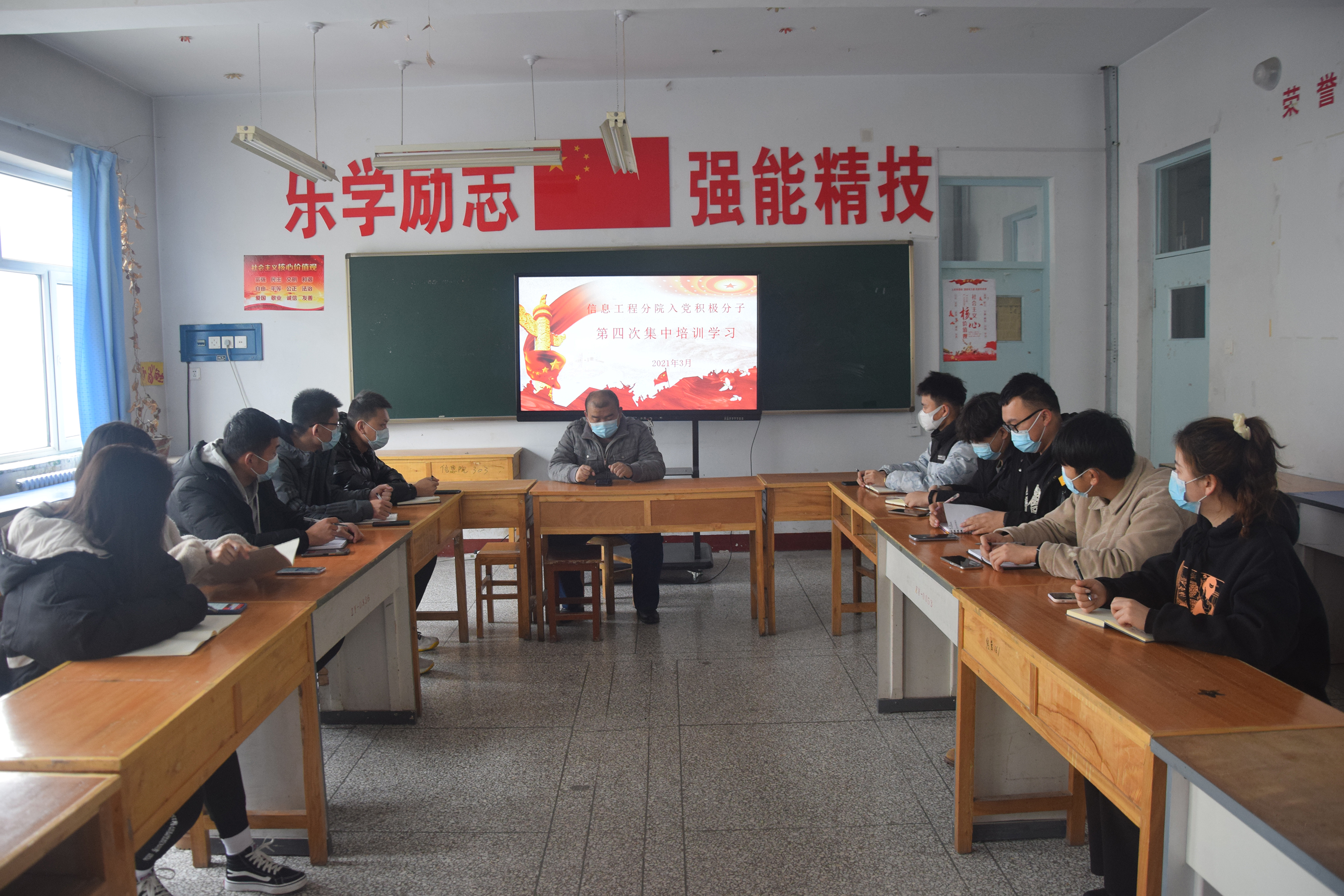 3月11日下午14时30分,信息工程分院在信息楼303教室开展了培养期内第四次入党积极分子集中学习教育活动,活动由分院副院长周鑫主持,分院全体入党积极分子学生参加。本期学习主要布置安排了按时观看石职之声平台发布的《党史故事100讲》视频;检查学习强国手机APP的学习积分情况和近期时事政治、理论新知识的学习交流。
