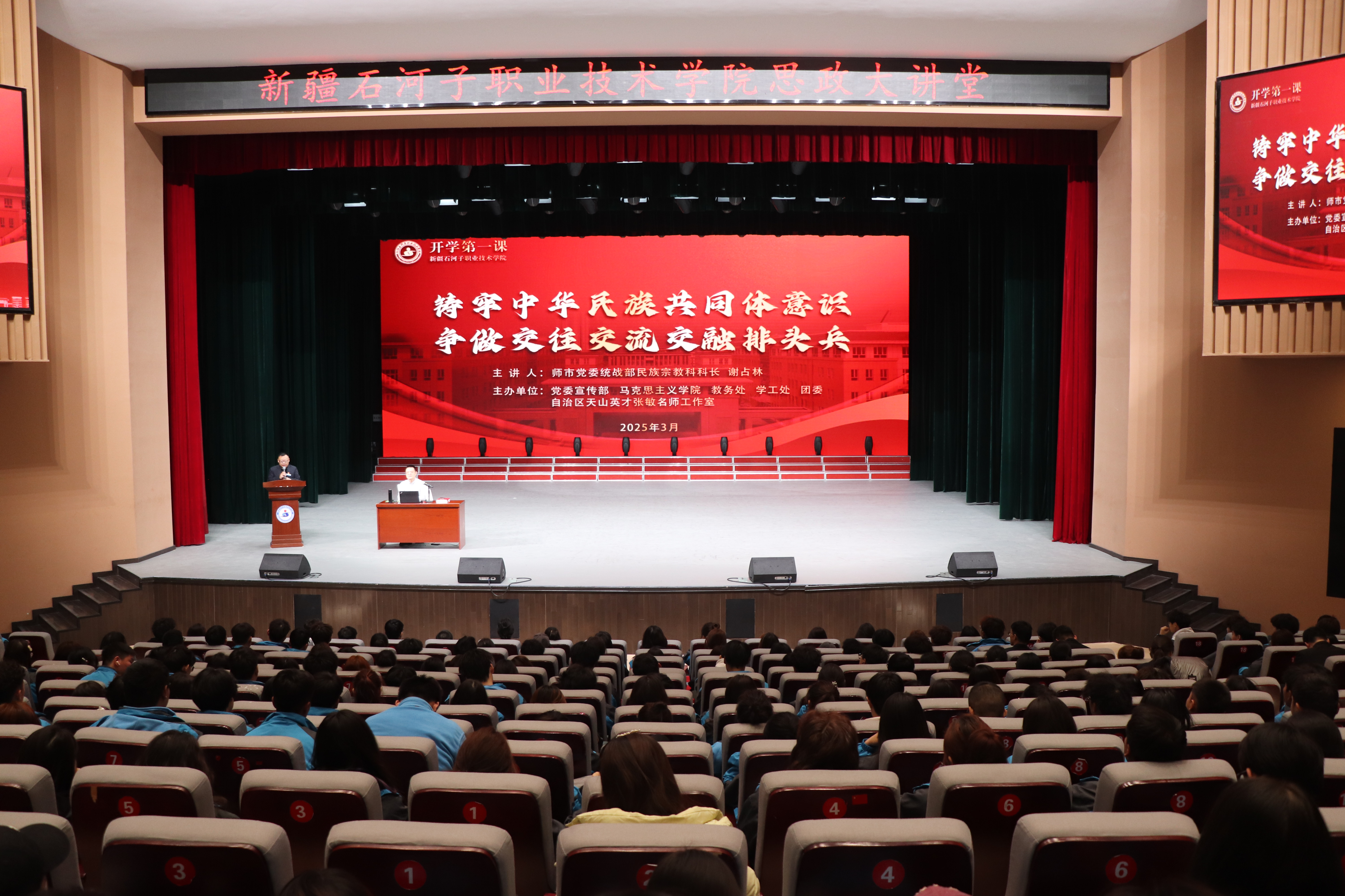 (王需 杨慧报道)3月6日,beat365唯一官方网站以线上线下相结合的方式,举办2025年春季学期开学第一课——“铸牢中华民族共同体意识,争做交往交流交融排头兵”主题讲座,特邀师市统战部民族宗教科科长谢占林担任主讲。讲座在学术报告厅举行,食品工程学院(化工与环境工程学院)在主会场、其他各学院在线上聆听讲座,在校师生7000余名共同开启这场意义非凡的思想之旅。