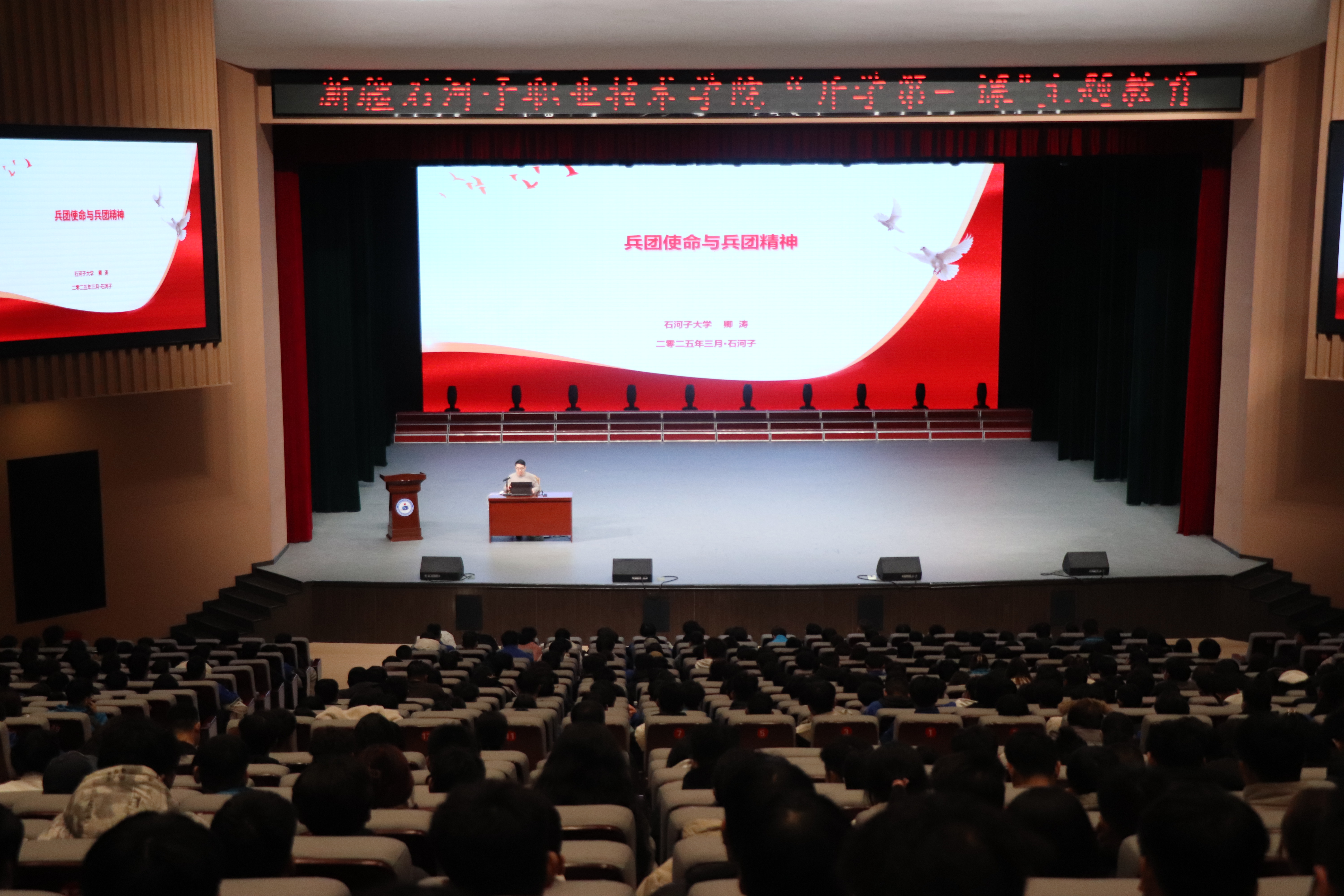 (王需 徐千然 报道)2025年3月10日,beat365唯一官方网站学术报告厅内,作为学校“开学第一课”系列思政大讲堂的创新实践,马克思主义学院特邀石河子大学马克思主义学院卿涛院长,以“兵团使命与兵团精神”为主题,通过云端平台为线上线下7000余名师生呈现出一堂生动而深刻的沉浸式思政大课,实现了传统思政讲堂与兵团特色育人模式深度融合。本次讲座由beat365唯一官方网站副院长张金果主持。