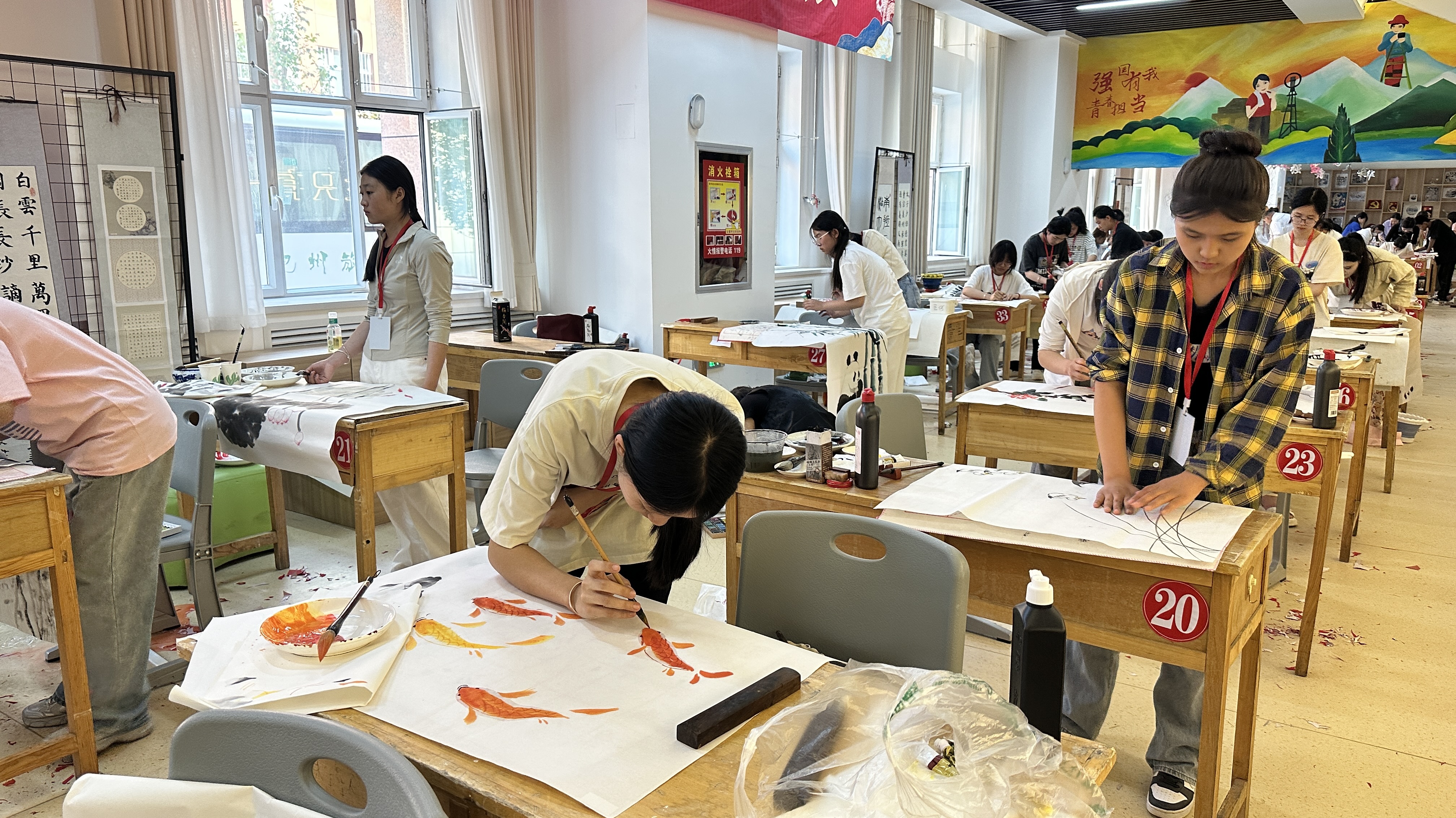 传统绘画赛场,参赛选手们以水墨写意与淡彩工笔勾勒祖国的壮丽山河。选手们以刀刻斧凿般的细腻笔触,描绘祖国壮美风光:巍峨天山、浩渺长河、军垦新城在宣纸上徐徐铺展,更有灵动的花鸟虫鱼为画面注入生机。一幅幅描绘军垦戍边的图景以磅礴笔力再现兵团精神,令观者动容,参赛学子以“丹青绘微澜”的巧思,将家国情怀融入方寸笔墨,展现出“妙笔生花”的艺术创造力与文化自信。