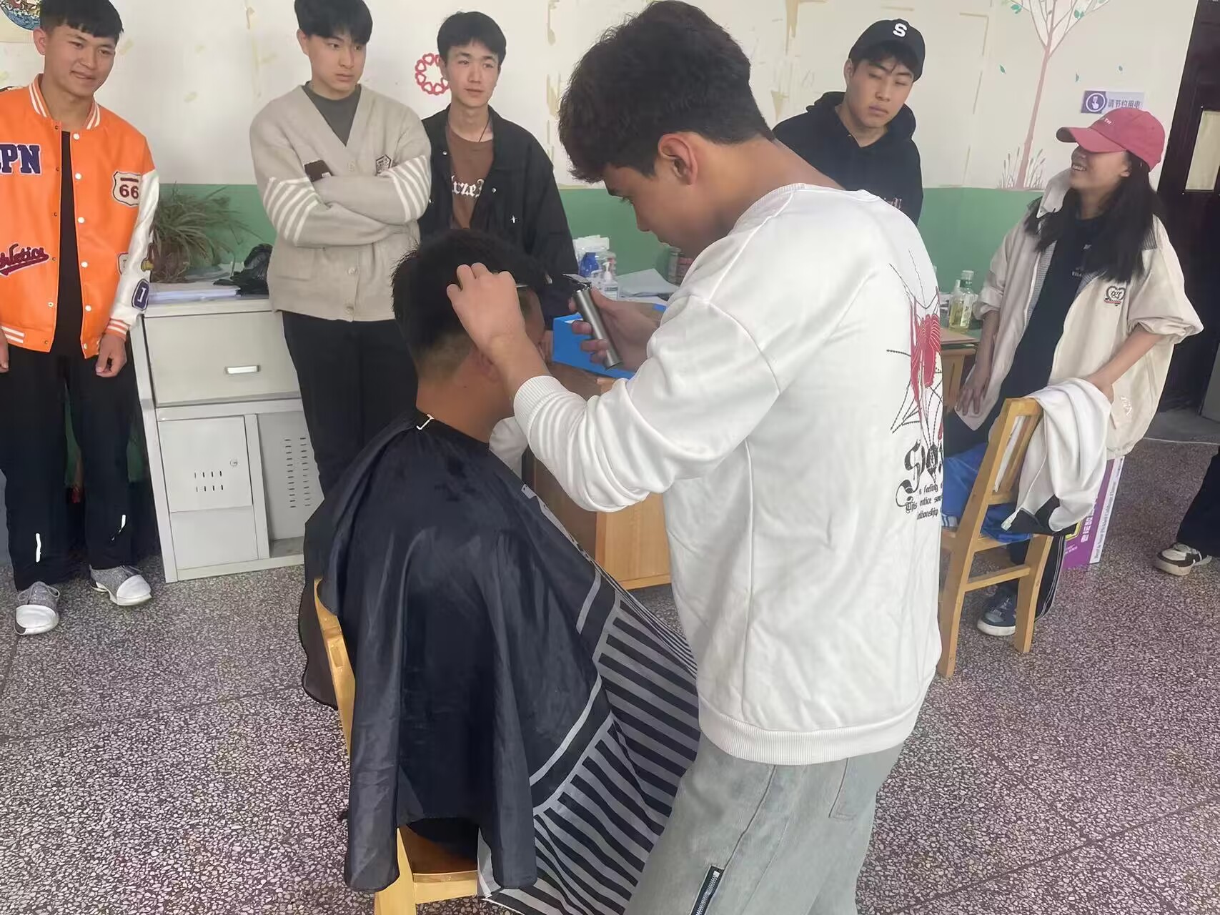 25汽修民族班的伊木然同学主动请缨,利用课外和周末休息时间,在学生宿舍门口为大家提供免费理发服务,帮助学生解决“头”等烦恼。理发现场,剪刀上下飞舞、电推嗡嗡作响,排队学生井然有序。理发后,同学们纷纷对“非专业”理发师技术赞不绝口,对志愿服务的同学表示感谢。