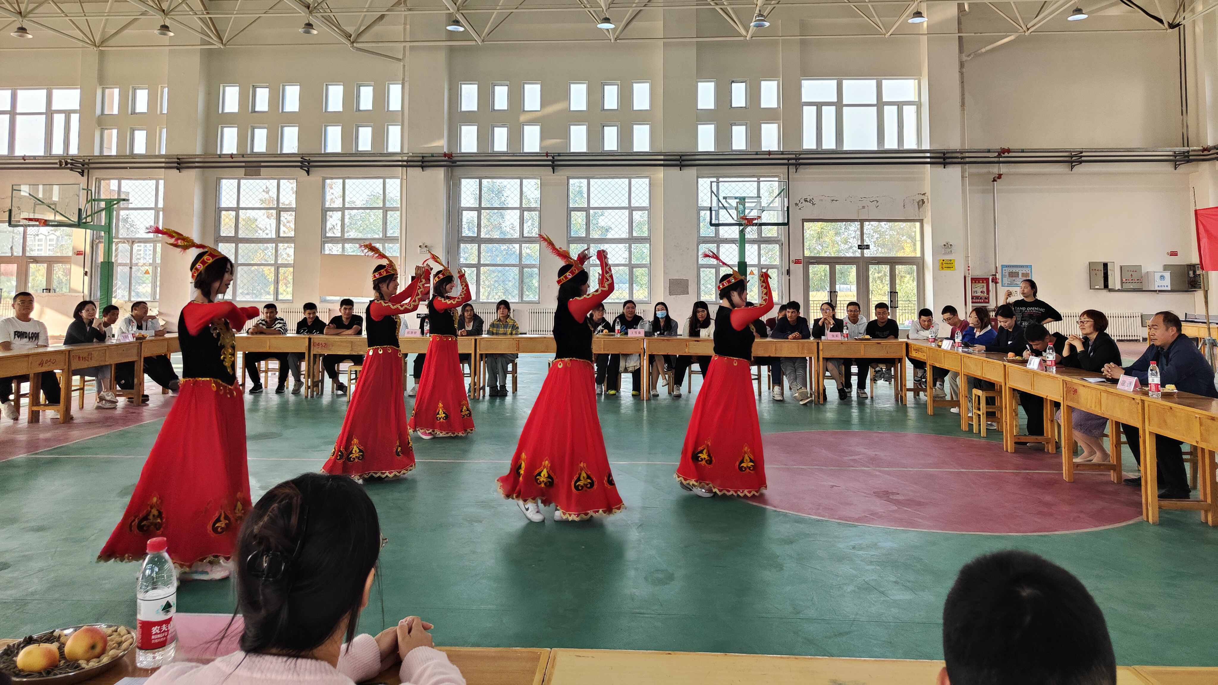 活动伊始,公共基础学院党总支书记吴晓晖表示,中秋是中华民族传统文化中象征团圆与和谐的节日。在多元的校园环境中,各民族师生们要像石榴籽一样紧紧抱在一起,相互尊重、相互理解、相互学习,共同营造一个团结友爱、和谐共处的学习氛围,将民族团结的理念深深植入心间。随后,身着色彩斑斓、具有民族特色服饰的幼教班同学们为大家带来了一场新疆舞表演,她们的动作轻盈优美,传递着民族文化的魅力;机电班、计算机班的同学们深情演唱了《花海》等流行歌曲,用歌声传递着青春的活力与激情;充满童趣的舞蹈《熊出没》为整个见面会增添了轻松愉快的氛围;慷慨激昂的《民族团结一家亲》演讲深刻阐述了民族团结的深远意义,掷地有声的话语让在场的每一个人都深刻意识到民族团结是中华民族的立身之本。最后,师生们携手共舞,欢呼声此起彼伏,气氛相当热烈。