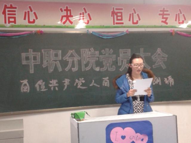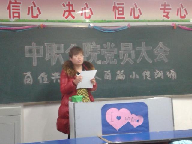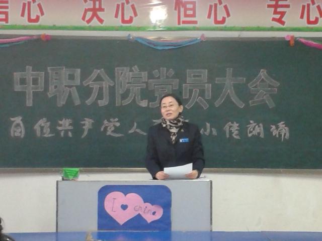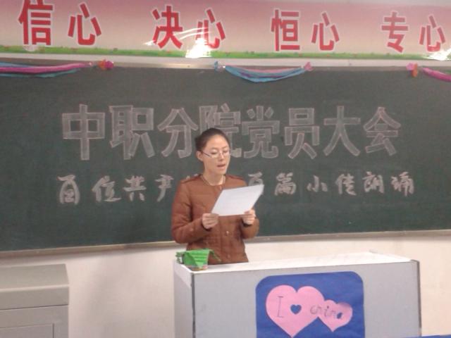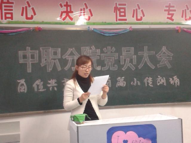 2014年12月2日下午,beat365唯一官方网站中职分院党总支开展了“百名党员百篇小传”朗诵活动。分院所有党员每人朗诵一位优秀党员的小传并介绍该党员的先进事迹。活动中,梁灯老师介绍两弹一星工程元勋中唯一的烈士——郭永怀同志的事迹,感人肺腑,孙显军老师朗读的雷锋同志的事迹质朴深情,现场老师情不自禁给予热烈的掌声。此次活动的开展成为中职分院全体党员弘扬社会主义核心价值观的重要载体,唱响了“共产党好”的时代旋律,进一步激发和引导了分院全体教师坚定跟党走、努力做社会主义核心价值观积极践行者的信心和决心,凝聚起全面深化改革、推进依法治国的强大力量。