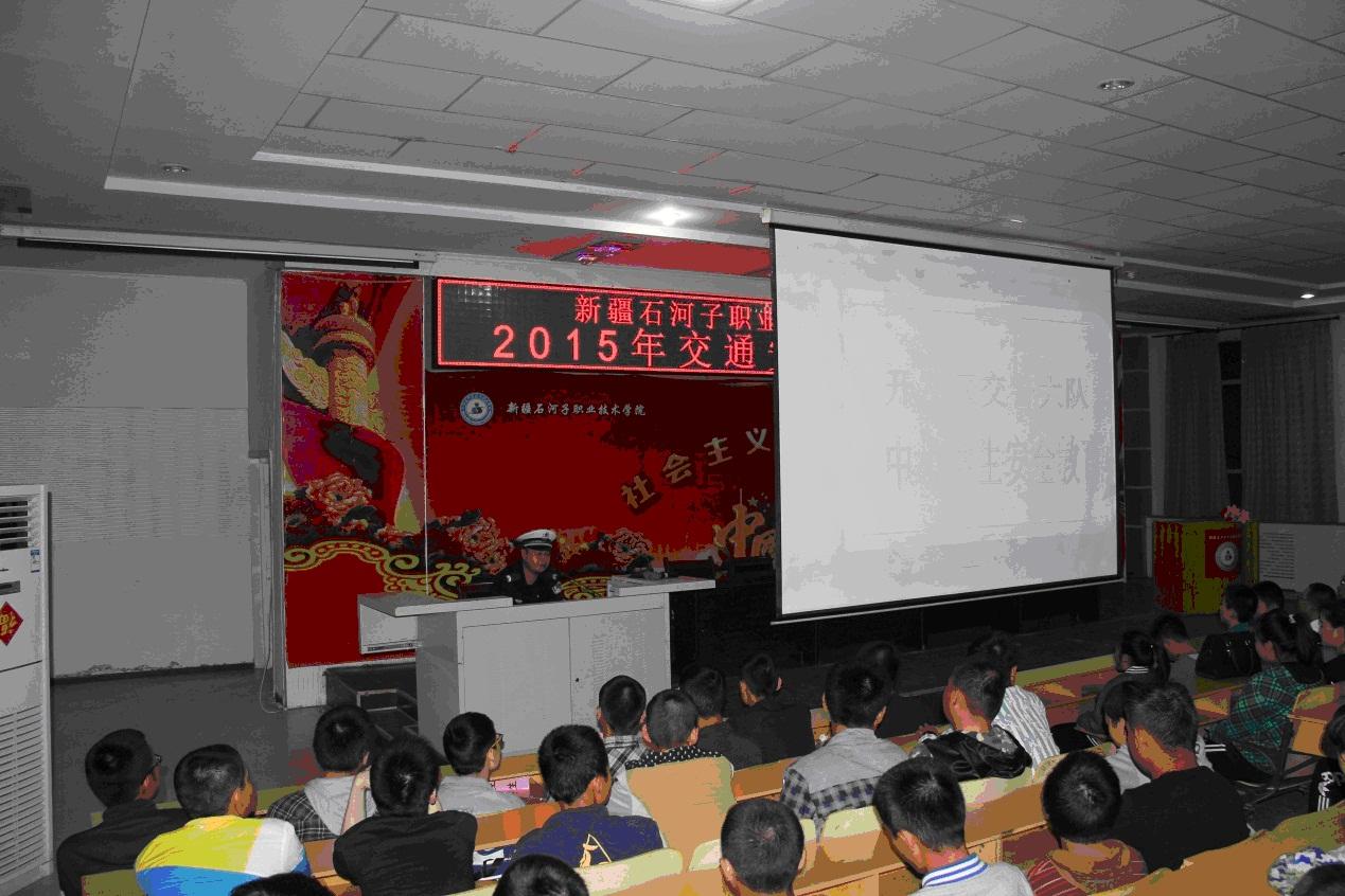期间的交通道路安全及法规专题讲座。本次讲座邀请了石河子公安局交警支队开发区大队警官雷强到场授课,授课采取了课件的形式。讲座图文并茂,生动鲜明;案例典型突出,教育意义深远,聆听的学生认真领悟本次讲座的主题思想,专题讲座结束后,中职分院汽车专业的学生自发组织,在后楼大厅观看了交通安全图片展和交通安全教育手抄报的展出。