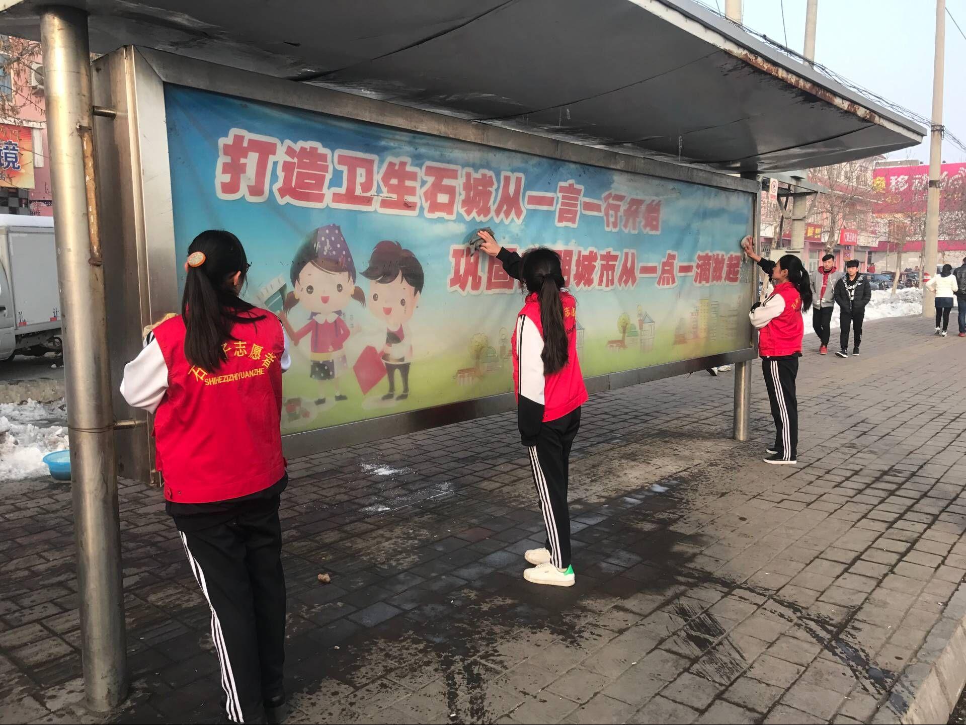 在活动中同学们冒着初春的寒气,弘扬雷锋不怕苦、不怕累的精神,擦拭了校门口双侧的公交站台,以及学校的电动门,大家团结一致,积极向上,服务同学,服务校园,美化石城、营造了向雷锋同志学习的氛围,积极弘扬了雷锋精神。