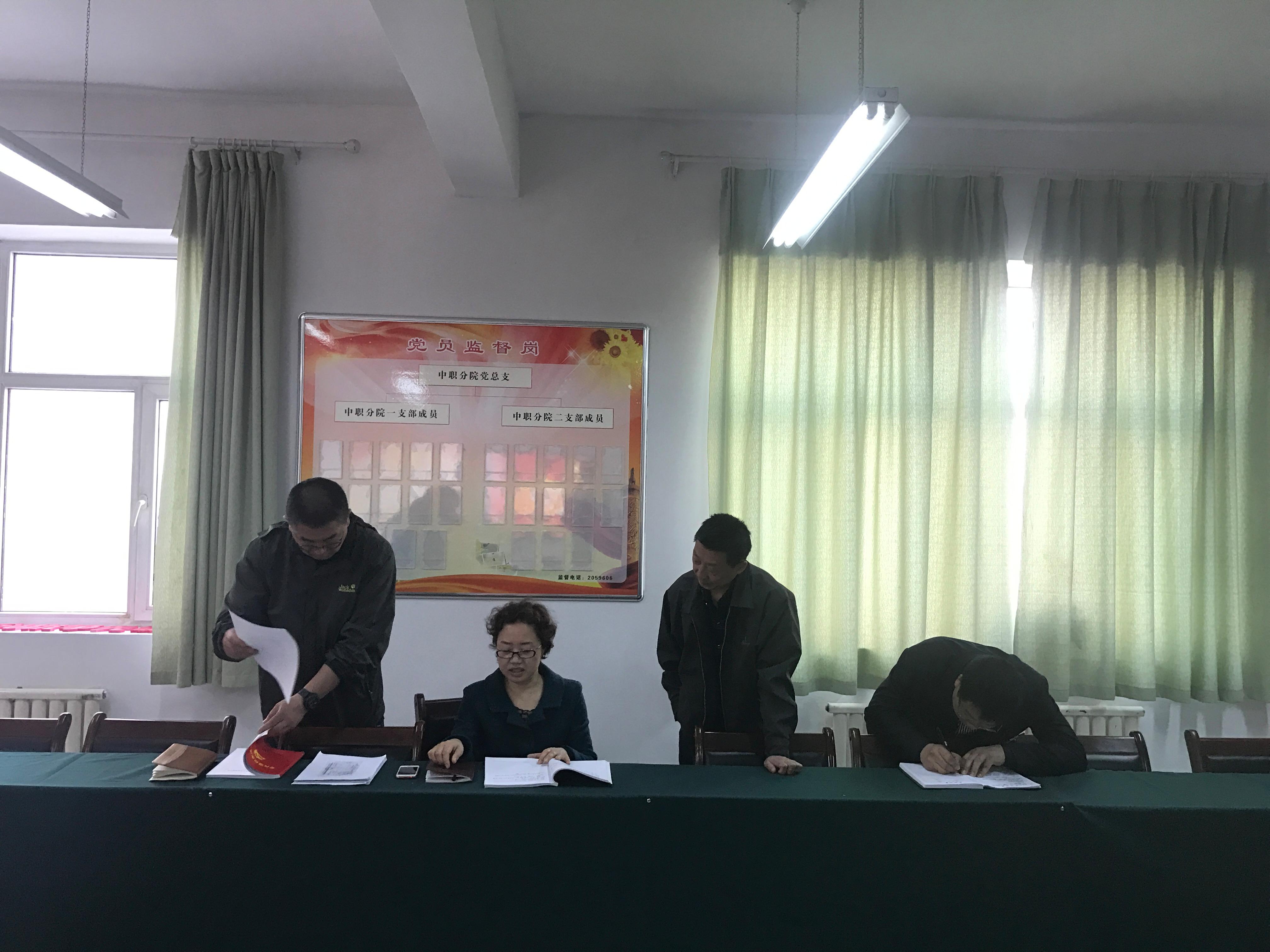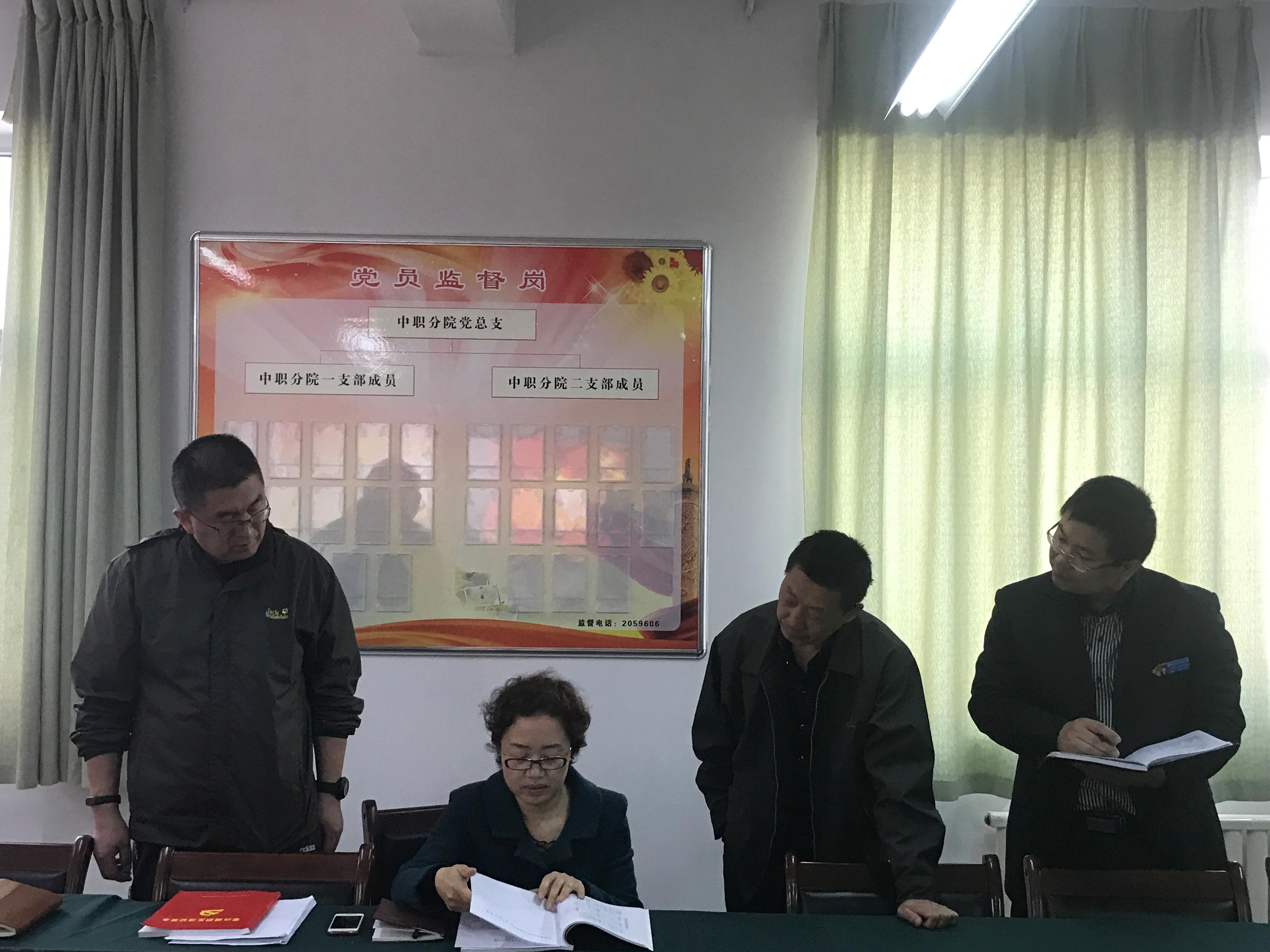 2017年4月11日上午11点,学院党委书记陈建丽、党政办副主任张金果,老师刘海生一行三人来到中职分院对分院党总支、基层支部工作进行调研检查,在中楼102党团活动室先对党内组织生活记录本进行检查,党团活动室的布置进行检查,对一支部党员学习、宣传情况提出建议与意见。中职分院党总支书记俞峰分别对一分钟党员专题片的三位推荐人情况进行逐一介绍。梁灯做一名义务普法者(法治教育、专题讲座) 费玉芝她赋予它新的生命(青蓝工程 、体育器材的保管与维护工作) 张洪涛 革命歌曲代代传(大合唱、学院录播等工作)。学办主任周吉新及杨凯老师陪同检查。